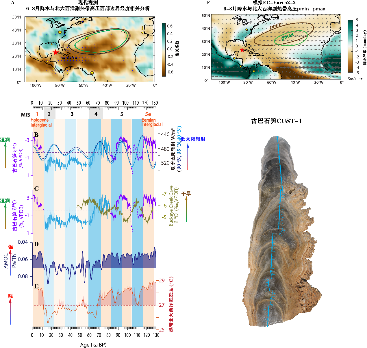 图2. 关键证据。A 现代观测(1979-2020)夏季北大西洋副热带高压西部边界偏西,大西洋暖池降水减少。B 古巴石笋δ18O记录与夏季太阳辐射对比。C 古巴石笋δ18O记录与北美Buckeye Creek洞记录对比。D AMOC代用指标Pa/Th比值。E 热带北大西洋海表温度。F 基于模式EC-Earth2-2轨道尺度理想实验pmin-pmax降水差值图和北大西洋副高分布图。下方是本研究石笋CUST-1。