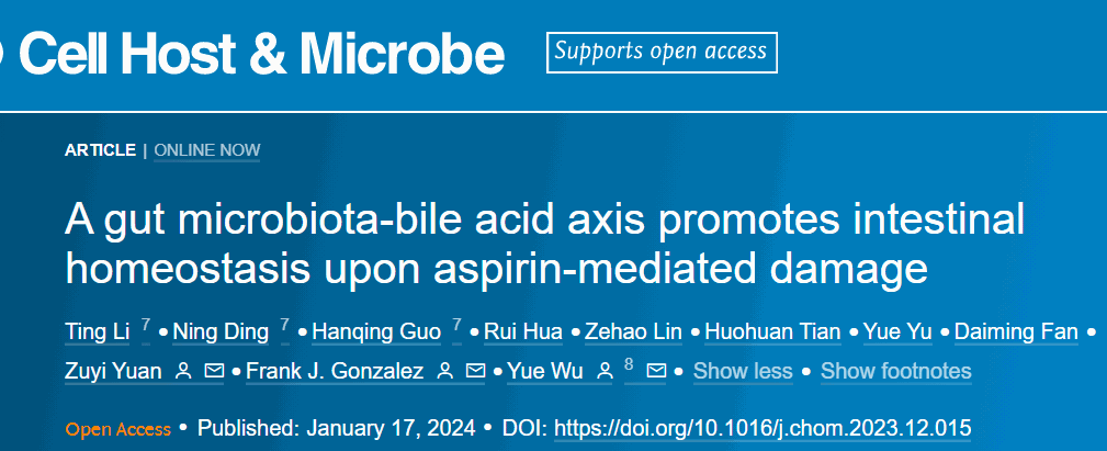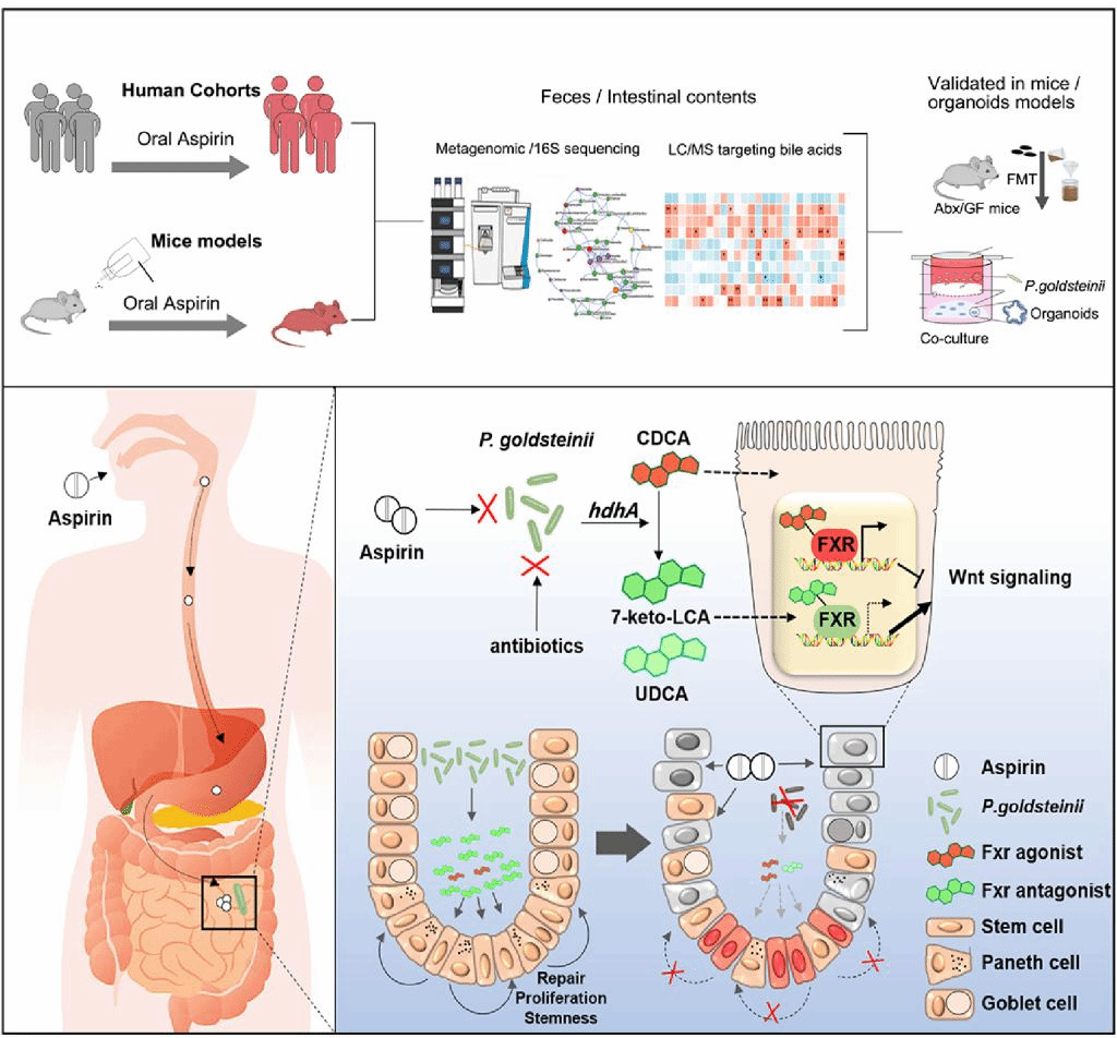 该成果发表于细胞杂志的微生物领域子刊《细胞-宿主与微生物》。论文系统阐明了阿司匹林引起肠道损伤的新机制,并首次提出通过“肠道菌群-胆汁酸轴”进行干预的策略,为阿司匹林等心血管药物副作用的防治提供了全新思路。阿司匹林作为全球最常用的药物之一,广泛应用于镇痛、抗血小板和肿瘤预防等领域。然而,其引发的胃肠道损伤问题长期困扰临床,超过90%的长期服药患者出现不同程度的肠道不良反应。尽管过去研究多关注于阿司匹林对前列腺素合成酶的抑制作用,但其引起肠道损伤的具体机制仍不明确。