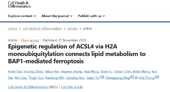 近日,西安交通大学张义磊教授联合同济大学史偈君教授团队于《细胞死亡和分化》(Cell Death & Differentiation)杂志上发表研究论文,揭示了BAP1通过H2Aub表过修饰调控ACSL4表达,驱动脂质代谢重编程,进而激活铁死亡的分子机制。