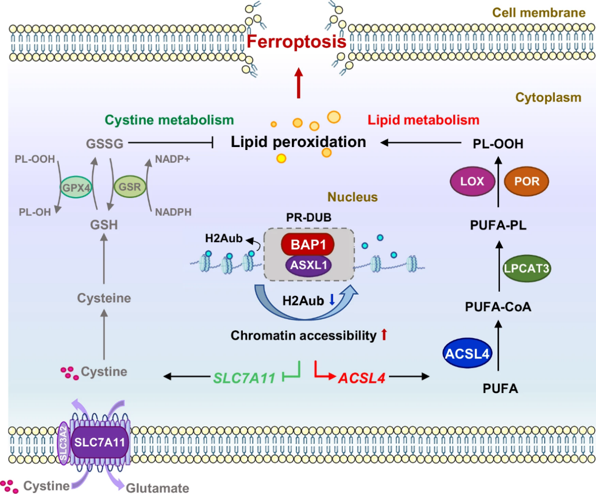 课题组前期研究成果先后解析了抑癌基因BAP1通过调控胱氨酸转运蛋白SLC7A11促进铁死亡是抑制双硫死亡的分子机制。该研究深化了对BAP1调控基因表达和肿瘤抑制功能的理解,也将表观遗传调控、脂代谢重组与铁死亡三个关键生物学过程连接起来,为BAP1相关肿瘤的精准治疗提供了新的代谢干预靶点。