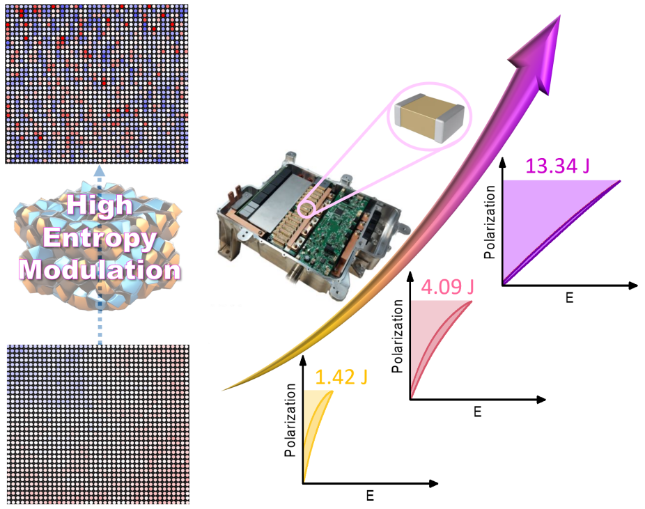 随着全球电动汽车产业向800V高压平台快速演进,车机系统关键电子元件正面临严苛挑战。作为能量转换核心部件的介电电容器,亟需在储能密度、充放电效率及循环稳定性等核心指标上实现跨越式突破。针对这一国家重大战略需求,西安交通大学武海军教授团队与香港理工大学黄海涛教授团队通过多尺度协同创新,成功开发出基于量子顺电-铁电/反铁电基介电固溶体的新一代储能材料体系。该成果于近日以《电容储能用高熵调制量子顺电钙钛矿》(High Entropy Modulated Quantum Paraelectric Perovskite for Capacitive Energy Storage)为题发表于国际高水平期刊《自然·通讯》(Nature Communications)。