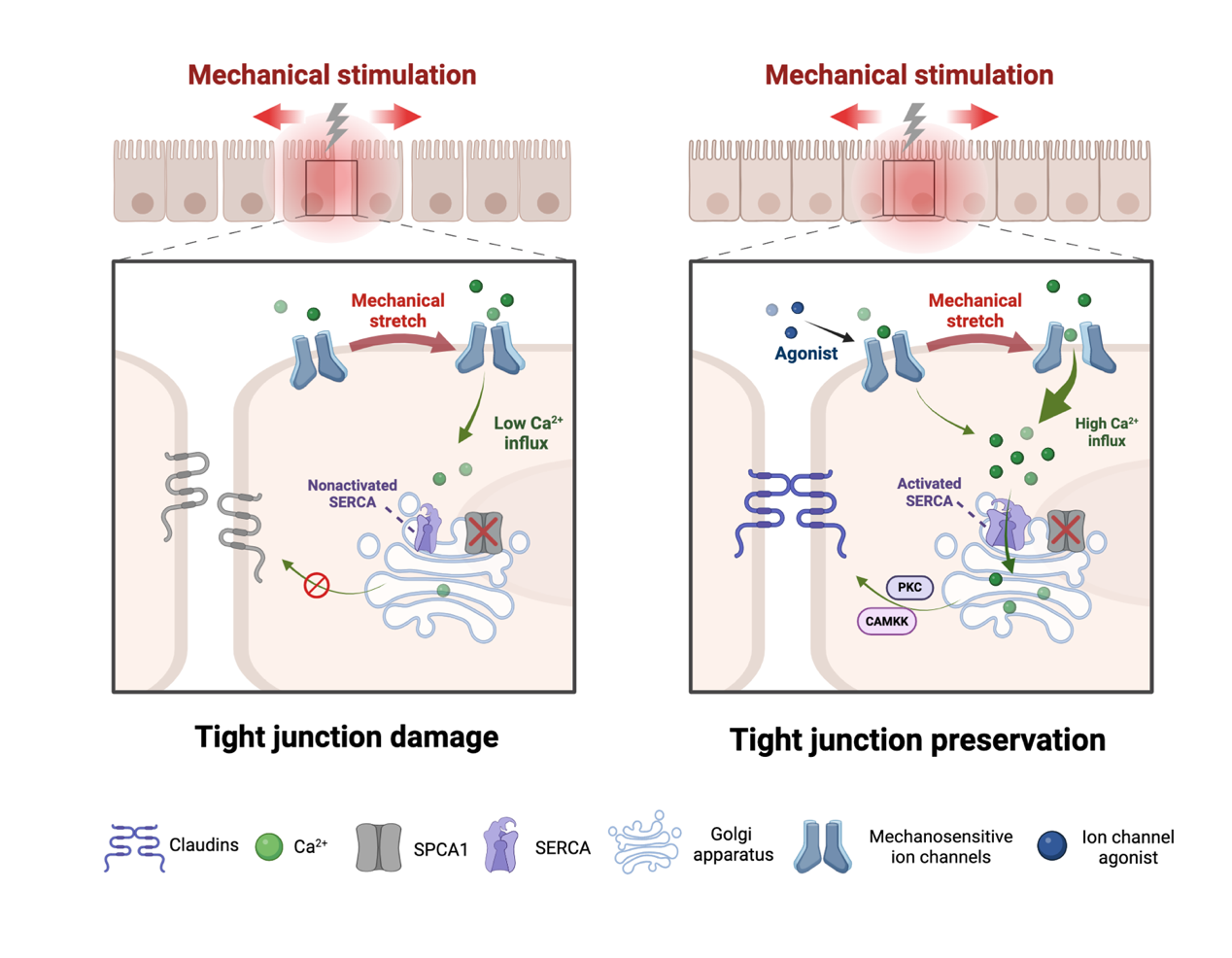 研究团队通过构建钙转运ATP酶2C型成员1敲低的角质形成细胞模型,并施加循环机械拉伸模拟体内摩擦应激,发现机械应力可导致紧密连接蛋白1与紧密连接蛋白4的表达下降和结构破坏。进一步实验表明,高钙环境仅能短暂缓解损伤,而使用压电型机械门控离子通道组件1的特异性激动剂或瞬时感受器电位香草酸受体4的激动剂则能显著增强机械刺激下的钙内流,并通过肌浆网/内质网钙离子-ATP酶将钙离子输送至高尔基体,进而通过蛋白激酶C/钙调蛋白依赖性蛋白激酶激酶信号通路上调紧密连接蛋白表达,最终维持细胞连接完整性。该保护作用仅见于机械敏感通道激活,非机械敏感通道的激动剂则无此效应。
