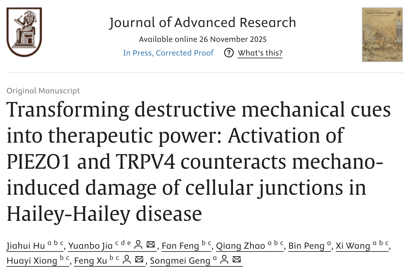面对这一罕见病诊疗难题,西安交通大学第二附属医院耿松梅教授团队立足“聚焦疑难、攻坚罕见”的科研定位,依托陕西省卫生健康委员会批准建设的“疑难罕见重症皮肤诊疗创新平台”,联合西安交通大学生命科学与技术学院徐峰教授团队,在皮肤力学微环境与罕见病机制交叉领域取得突破性进展。2025年11月,团队在国际综合性期刊《前沿研究杂志》(《Journal of Advanced Research》,影响因子13.0分,中国科学院一区TOP)发表题为 “将破坏性机械信号转化为治疗力:压电型机械门控离子通道组件1和瞬时感受器电位香草酸受体4的激活可抵消慢性家族性良性天疱疮中机械诱导的细胞连接损伤” (“Transforming destructive mechanical cues into therapeutic power: Activation of PIEZO1 and TRPV4 counteracts mechano-induced damage of cellular junctions in Hailey-Hailey disease”)的原创研究论文。