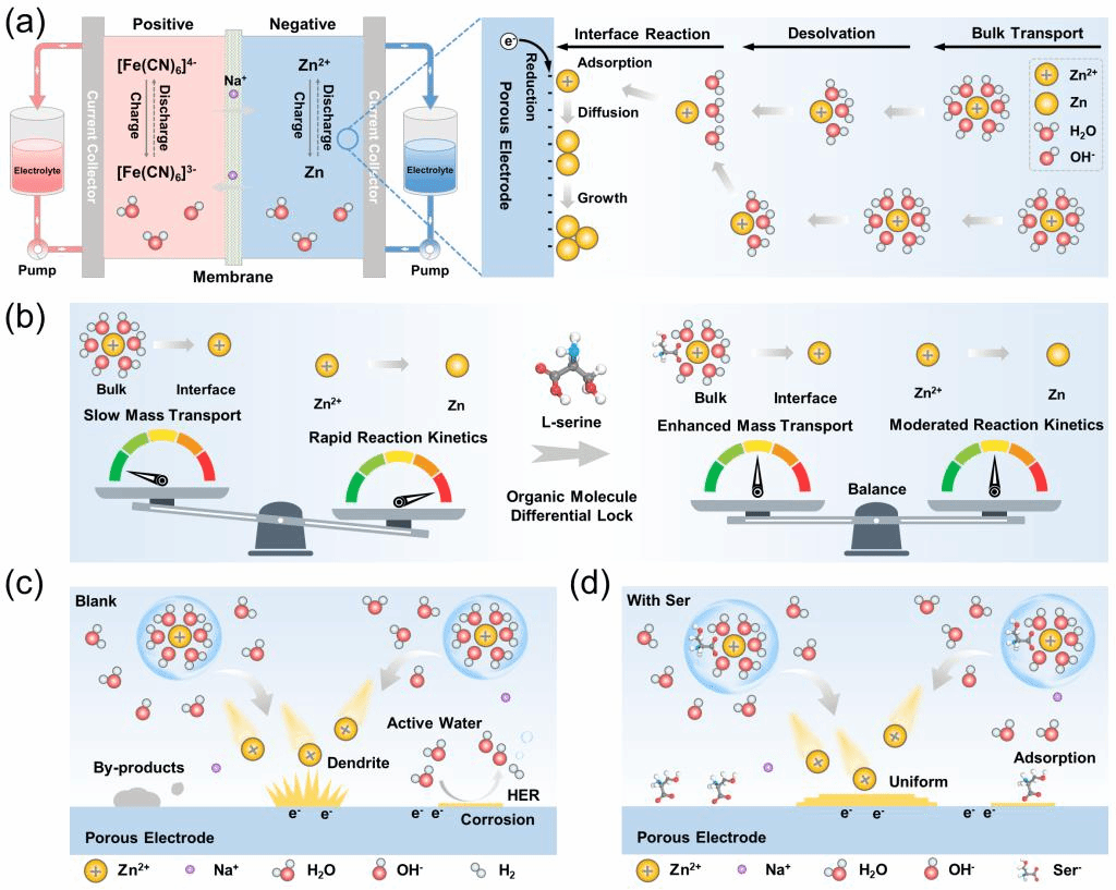 针对上述挑战,西安交通大学能动学院何雅玲院士、李印实教授科研团队创新性地提出了“有机分子差速锁”的概念,报道了一种利用L-丝氨酸(Ser)添加剂来构建有机分子差速锁的策略。其核心设计理念在于将Ser作为多功能添加剂部署到负极电解液中,通过体相和界面的分区调控建立一个锌离子传输和电化学反应平衡的有利化学环境,从而实现碱性锌基液流电池的长时稳定循环。