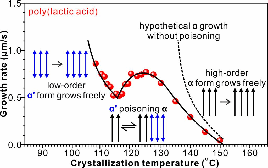 图1. 聚乳酸球晶生长速率-结晶温度曲线,以及多晶相自中毒机制的示意图