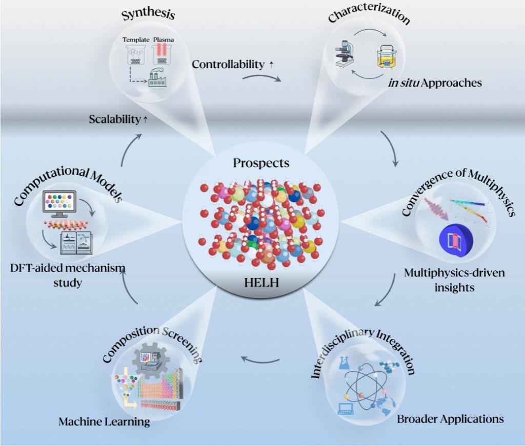 针对上述情况,西安交通大学化学学院郗凯教授团队系统总结并深入探讨了高熵层状氢氧化物(HELHs)的最新研究进展。团队指出,近年来,高熵材料(HEMs)概念的引入为材料科学带来了革命性的机遇。高熵层状氢氧化物(HELHs)通过引入五种或更多种金属阳离子,借助高构型熵实现显著的热力学稳定效应、晶格畸变诱导的电子结构调控以及多元“鸡尾酒”协同效应,不仅有效克服传统LDHs的性能局限,更展现出超乎寻常的电化学活性与机械/化学稳定性。尽管HELHs在理论与实验层面均表现出突破性潜力,该领域仍面临三大挑战:可控合成方法尚未体系化、复杂系统中构效关系的机理解析不足,以及面向能源-生物-环境等跨领域应用的集成探索仍处于初步阶段。解决这些关键问题,将成为HELHs实现材料-器件-系统级跨越的必然路径。