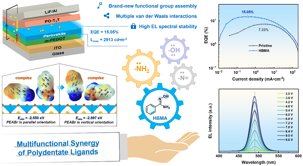 对此,吴朝新教授团队设计并合成了一种新型多齿配体——(Z)-N’-羟基苯甲脒(HBMA),系统探究了其在全溴低维蓝光钙钛矿中的多功能协同效应。该新型配体HBMA分子同时包含肟基(oxime)和胺基(amine)官能团,可提供三个共轭的路易斯碱极性中心(-OH、=N-、-NH2),形成了沿苯环单一取代方位的电子诱导与偶极取向。该三极性中心集中分布的结构特点可以提供更多种类的键型和成键机会,不仅通过配位键(N···Pb2+和O···Pb2+)有效钝化钙钛矿表面的Pb2+缺陷,也与有机间隔阳离子苯乙基溴化铵(PEABr)形成多种氢键主导的弱相互作用(N···H-N和O···H-N)。研究表明,氢键结合的PEABr-HBMA复合物可以更稳定地吸附在钙钛矿表面,这种结合模式有效地抑制了PEA+从钙钛矿表面的解离。其次,在PEABr-HBMA复合物整体吸附状态的研究中,PEA+和HBMA分别处于竖直吸附和水平吸附状态,符合它们单独的热力学吸附过程。基于HBMA改性后的纯溴PeLEDs在天蓝光波段实现了15.05%的高外量子效率(EQE),为未修饰器件的两倍以上,同时最高亮度达到2913 cd·m-2,并在宽驱动电压范围(3.0~9.6 V)内表现出卓越的光谱稳定性。研究也通过对HBMA衍生物(DHIPMA、DHTPMA、THBTMA)的器件性能对比,进一步强调了取代基数量与空间偶极在配体设计中的关键作用。这项研究为钙钛矿体系中多功能配体的合理设计与多功能协同机制提供了有价值的见解。