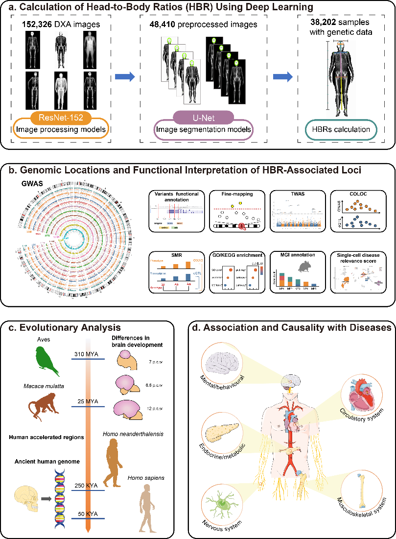 综上,研究构建了一条“深度学习影像表型提取—遗传结构解析—功能注释—疾病关联”的完整研究链条,为复杂形态表型的遗传结构研究提供了可复用的技术范式。研究鉴定的头身比相关遗传位点及其疾病关联特征,为疾病风险分层和个体化干预提供了新的潜在生物标志物。对头身比演化意义的系统分析,也为理解人类脑体比例演化及物种适应性进化提供了新的研究视角。研究充分展示了深度学习技术在医学影像表型挖掘中的应用潜力,为多学科交叉研究提供了新的思路与方法。