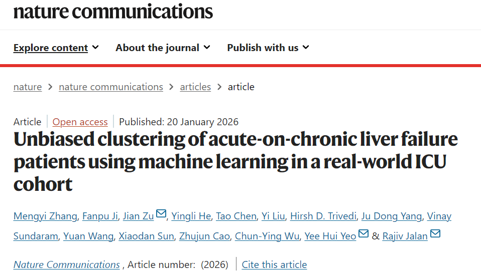 慢加急性肝衰竭 (ACLF) 是一种复杂疾病,定义各异,特征不明确,这使得风险分层和针对性管理变得复杂,而无监督聚类可以通过消除预定义的假设实现了无偏见的群组分层。西安交通大学数学与统计学院祖建教授团队、西安交通大学第二附属医院肝病科纪泛扑教授团队,洛杉矶Cedars-Sinai Medical Center杨毅辉博士以及英国伦敦大学学院Rajiv Jalan教授合作开展系列工作,基于现实世界ICU队列使用机器学习模型对慢加急性肝衰竭患者进行无偏聚类,揭示关键聚类特征分布规律,量化各亚型间死亡率风险差异,并解析了不同集群的临床表型特征。相关成果发表在Nature Communications(《自然通讯》)上,西安交通大学数学与统计学院为第一完成单位。