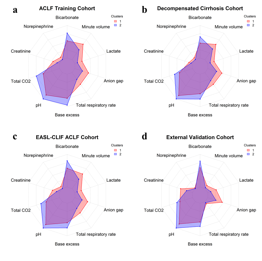 在验证分析中,研究利用Lee-2模型对更大规模的ICU中的失代偿性肝硬化患者队列(无论是否发展成ACLF)进行了验证,证明了聚类模型的稳健性及其在真实世界环境中的潜在可用性。同时,Lee-2在欧洲肝病研究协会(EASL-CLIF)定义的ACLF队列中的良好表现也证明了其广泛的适用性。同时研究还使用独立队列对聚类模型进行了外部验证,其外部验证结果也证实了模型的稳定性和可重复性(图3)。