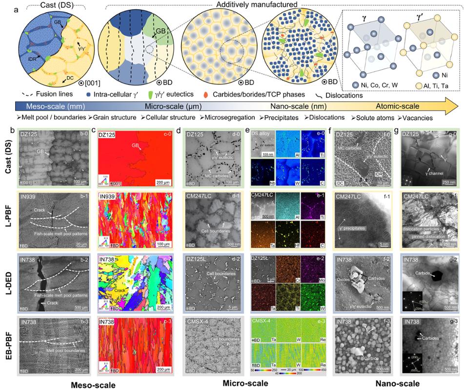 图2 传统铸态定向晶与不同增材制造工艺制备镍基高温合金的显微组织结构对比。(a) 铸态定向晶组织及增材制造过程中形成的多尺度组织结构; (b-g) 不同打印态不可焊镍基高温合金的熔池形貌、晶粒形貌和晶体取向、枝晶组织、元素分布、析出相及位错结构
