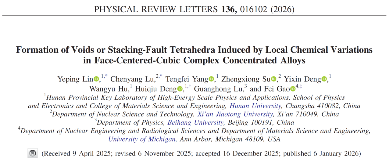 近日,西安交通大学卢晨阳教授在揭示原子尺度核材料缺陷演化规律方面取得进展,研究成果以《面心立方复杂固溶体合金中局部化学成分变化诱发的空洞或堆垛层错四面体的形成》(formation of voids or stacking-fault tetrahedra induced by local chemical variations in face-centered-cubic complex concentrated alloys)于1月6日发表在世界物理学高水平学术期刊《物理评论快报》(physical review letters)上。该工作由湖南大学、西安交通大学、密歇根大学等单位合作完成,卢晨阳教授是文章的共同第一作者。