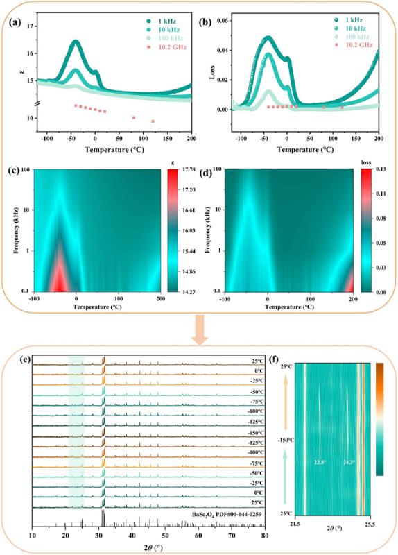 团队通过介温谱与原位XRD技术,首次发现BaSc2O4在−40℃附近存在可逆低温相变:当温度降至−75℃时,材料出现新衍射峰,回升至+ 25℃后衍射峰消失,并伴随介电损耗的剧烈变化。这一特性使其在低温传感领域具备独特潜力,可开发循环使用低温温度传感器,拓展了微波陶瓷的应用。