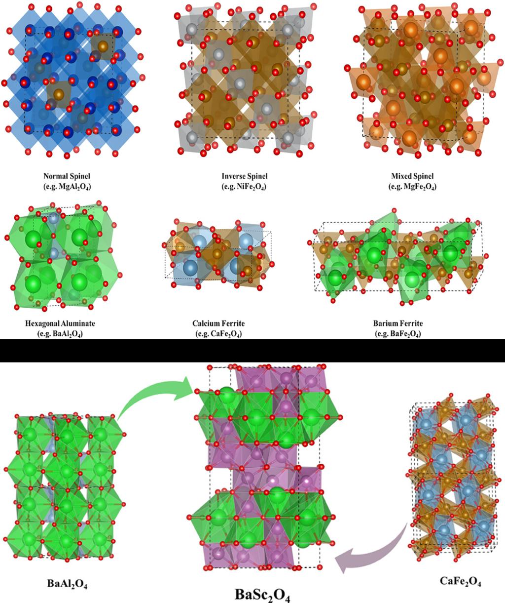 图1:常见AB2O4型晶体结构的典型类型示意图及BaSc2O4与同类化合物的结构特性关联