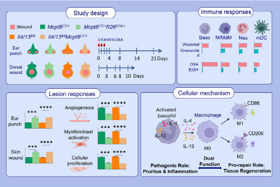该研究团队发现了一条清晰的“修复链条”:嗜碱性粒细胞释放IL-4/ IL-13,这些信号“指挥”巨噬细胞转变为修复型(M2),M2巨噬细胞促进表皮再生、新生血管形成、伤口快速闭合。当研究人员把嗜碱性粒细胞“清空”,或者切断它们的IL-4/ IL-13,皮肤修复立刻变慢;而把这些因子补回来,修复能力又回来了。一句话总结:AD患者皮肤不是在“硬扛搔抓”,而是免疫系统在主动补救。