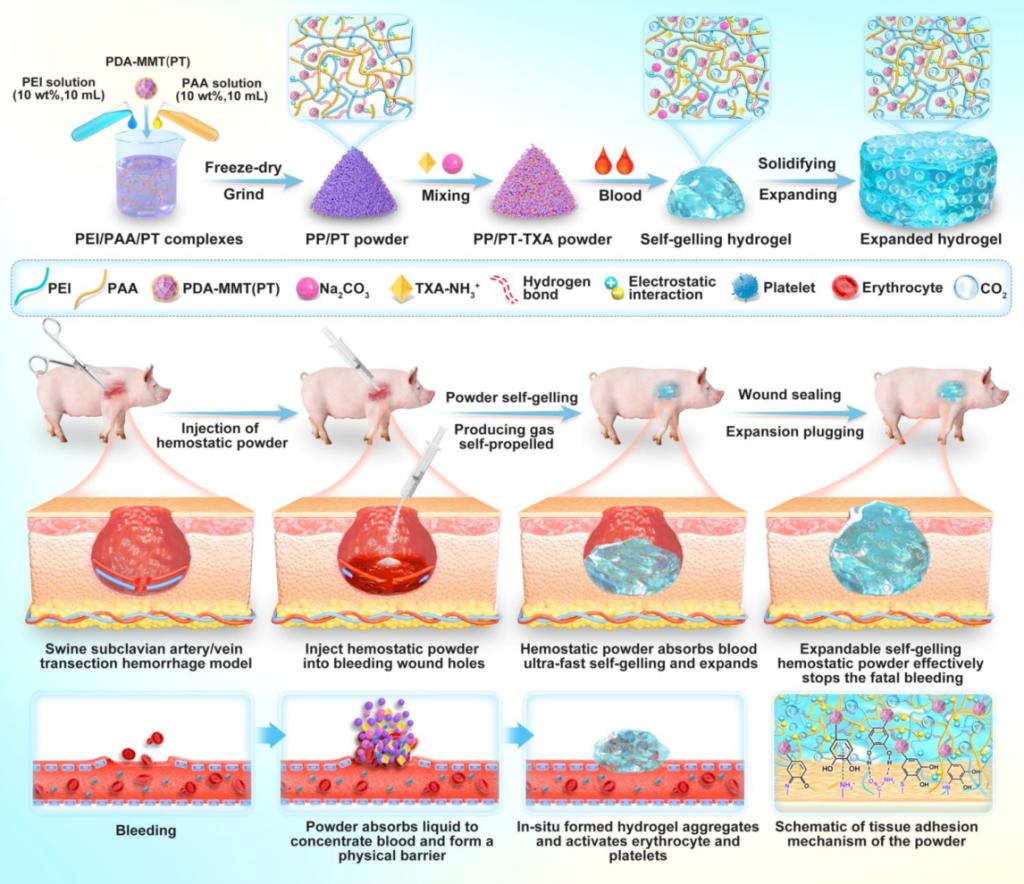 针对上述挑战,并基于课题组在可注射、可膨胀止血材料方面的长期积累(Nature Reviews Chemistry, 2021, 5(11): 773-791;Nat. Commun. 2018, 9, 2784; Adv. Mater. 2024, 36, 2308701; National Science Review, 2022, 9(11): nwac162; Biomaterials, 2025, 315: 122936),西安交通大学前沿院郭保林教授团队提出了全新的材料设计范式:将“便携粉末的储存稳定性”、“液态材料的渗透与贴合性”以及“固态凝胶的强韧粘附性”三者优势合而为一。团队成功研制出一种超快速自凝胶、自膨胀、自推进、高粘附的促凝止血粉末。该粉末以聚乙烯亚胺(PEI)和聚丙烯酸(PAA)形成的超快物理交联网络为核心,引入多巴胺修饰的蒙脱土(PDA-MMT)以显著增强湿态组织粘附力;更关键的是,创新性地将质子化氨甲环酸(TXA-NH₃⁺)与碳酸钠(Na₂CO₃)组成的发泡体系集成于粉末中,使其在接触血液的瞬间(2秒内)不仅快速凝胶化,更能通过持续的酸碱反应释放二氧化碳气体,驱动材料实现高达400%的体积膨胀和自主推进,从而主动填充并封闭不规则深部出血位点(图1)。该材料的止血机制是一种卓越的多重协同:1)物理密封:快速凝胶与自主膨胀即时在破裂血管处形成高强度的物理屏障;2)生化促凝:材料高效富集血液中的凝血因子、激活血小板与红细胞,同时释放的氨甲环酸(TXA)强力抑制纤维蛋白溶解,从多个通路加速并稳固天然凝血过程;3)强效粘附:基于儿茶酚化学的湿粘附作用,确保凝胶屏障即使在血流冲击下也能与周围组织紧密贴合,耐受超过400 mmHg的爆破压力(远高于人体收缩压)。