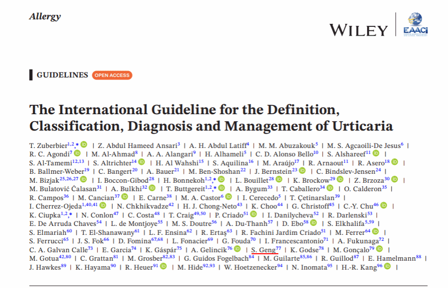 该国际指南是全球荨麻疹诊疗领域最具权威性的循证医学文件,本次更新严格遵循Cochrane协作网和GRADE工作组推荐的方法学标准,汇聚了来自59个国家、107个国内外学术机构的210位专家共同参与。耿松梅教授主任参与了此次国际指南的制定工作。
