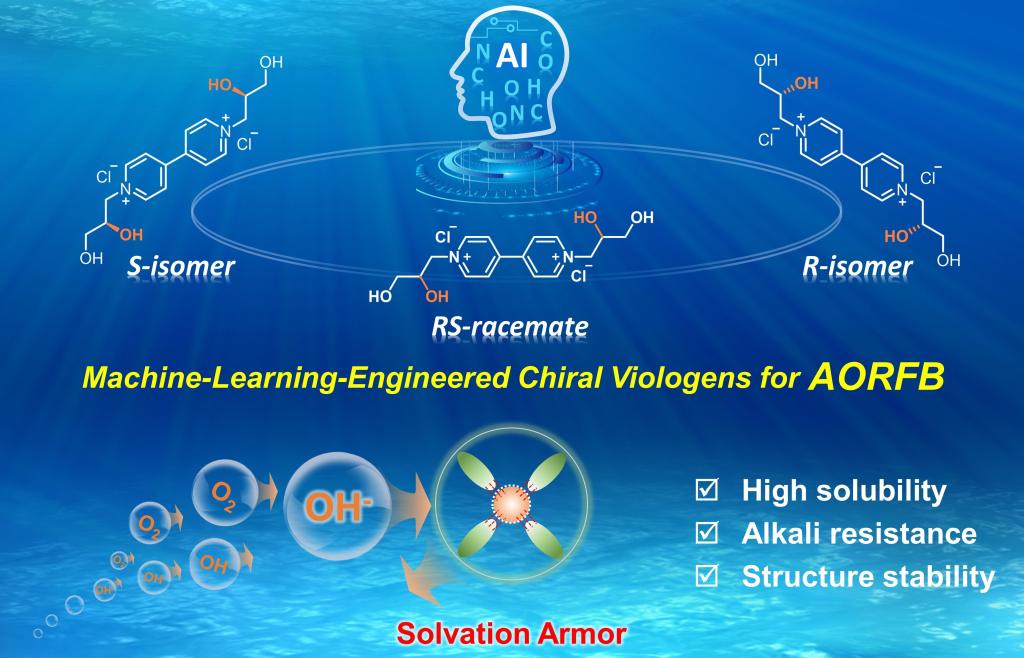 针对上述问题,西安交通大学前沿院何刚教授课题组在前期工作基础上,率先利用大型语言模型(LLMs)的机器学习策略,经过1300多项AORFB研究训练,用于预测具有邻位二羟基基团的手性紫精。这种键合网络形成了一种动态、pH适应性的“溶剂化装甲”,稳定了紫精母体结构。R-/S-对映体的溶解度比RS-外消旋体高1.66倍。分子模拟和原位光谱证实,二羟基基团通过溶剂化结构保护反应性C-N键,从而增强紫精在pH=11范围内的稳定性。基于此,对称电池(1 M)在3652次循环中实现了99.42%的容量保留率。1 M R基AORFB在533次循环中保持100%容量,优于[(NPr)2V]Cl4(94.92%)和磺酸改性紫精[(SPr)2V](65.49%)。此外,kg-Ah级手性紫精的规模合成以及电堆测试(2M)得到成功验证,证明手性紫精具有极大的产业化潜力。