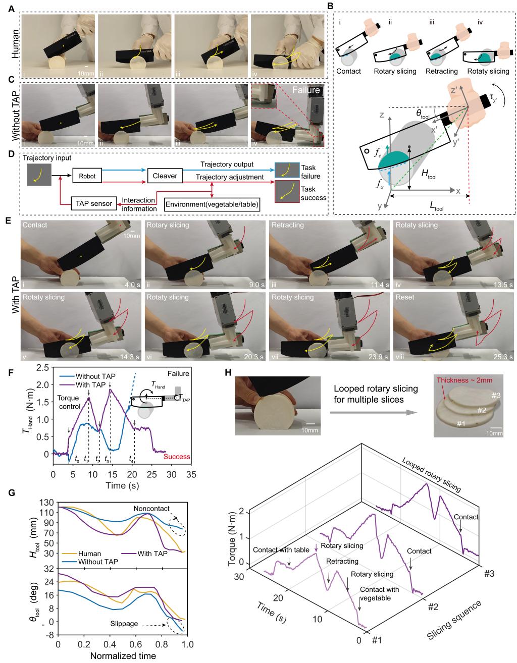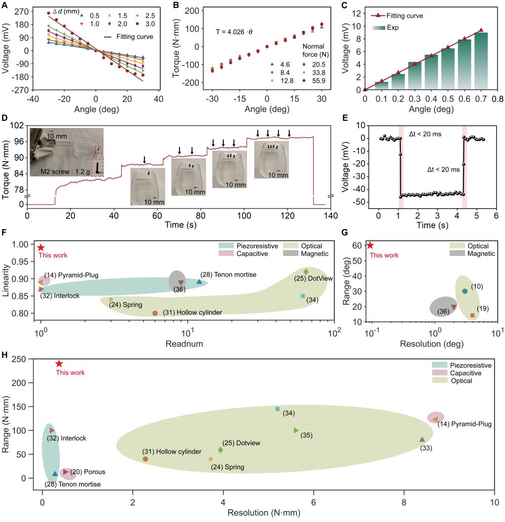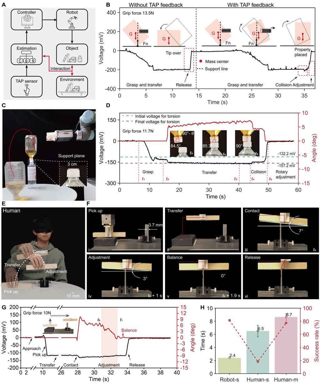 为实现如人类的精细化操作,研究团队提出的TAP传感器通过单个读出通道即可在宽范围(±241.6 牛顿·毫米)内实现双向、高灵敏度(角度分辨率0.1°,扭矩分辨率0.4 牛顿·毫米)和高线性度(R²=0.99)的扭矩感知。实验表明,TAP传感器能够同时感知压力和扭转信息,响应时间约为20毫秒。将这一传感器集成到机器人控制系统中,机器人能够在无视觉条件下完成多项精细操作任务:将一个倾斜46°的牛奶盒平稳放置、在2.4秒内完成平衡木堆叠挑战(成功率81.5%),以及通过实时调整切割路径完成白萝卜切片。