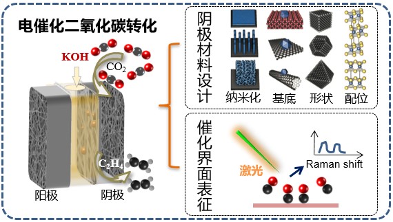 2. 原位电化学拉曼光谱研究二氧化碳还原中的界面变化。通过原位手段,研究界面在反应中的动态变化,为进一步设计优化器件提供指导。