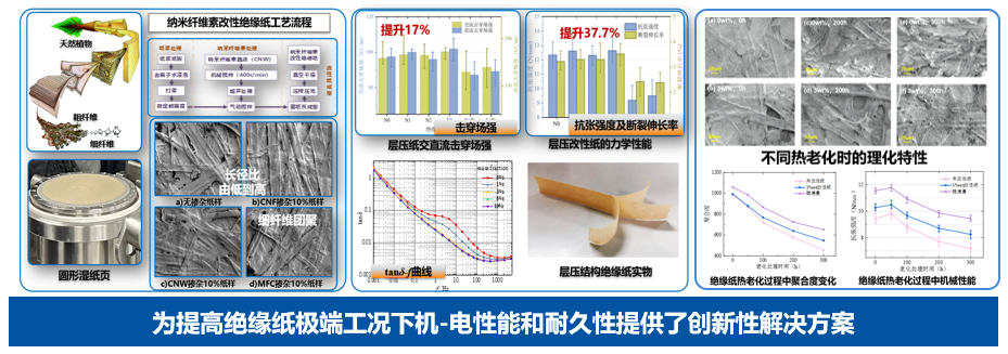 围绕微/纳米纤维素体掺杂改性与层压工艺绝缘纸,针对受潮引发冻融效应、高低温老化及短时电动力等引起绝缘纸机械性能下降问题,研发了使用纤维素体夹心的“三明治结构”改性绝缘纸,击穿场强提升17%,机械强度提升37.7%。