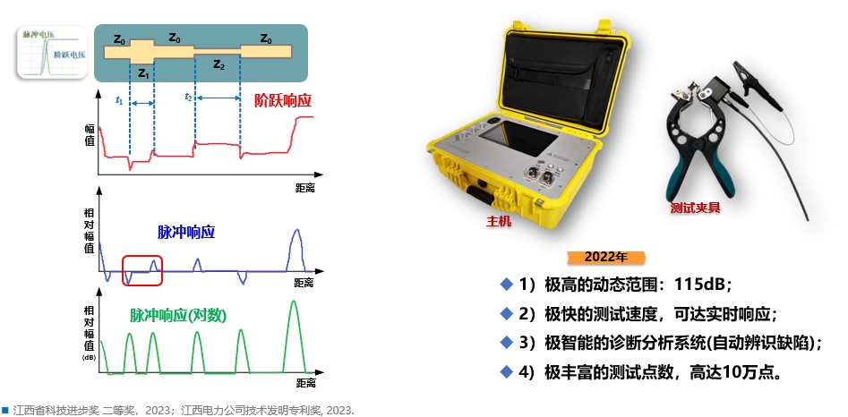 提出基于改进积分变换的宽频阻抗谱“时域-空间域”转换算法,提出了融合脉冲响应、阶跃响应的电缆缺陷劣化程度判断方法,发明了基于变分模态分解的首端干扰抑制方法。研制了宽频域、高动态范围的电缆局部潜伏性缺陷阻抗谱诊断定位仪器,定位误差小于0.3%。