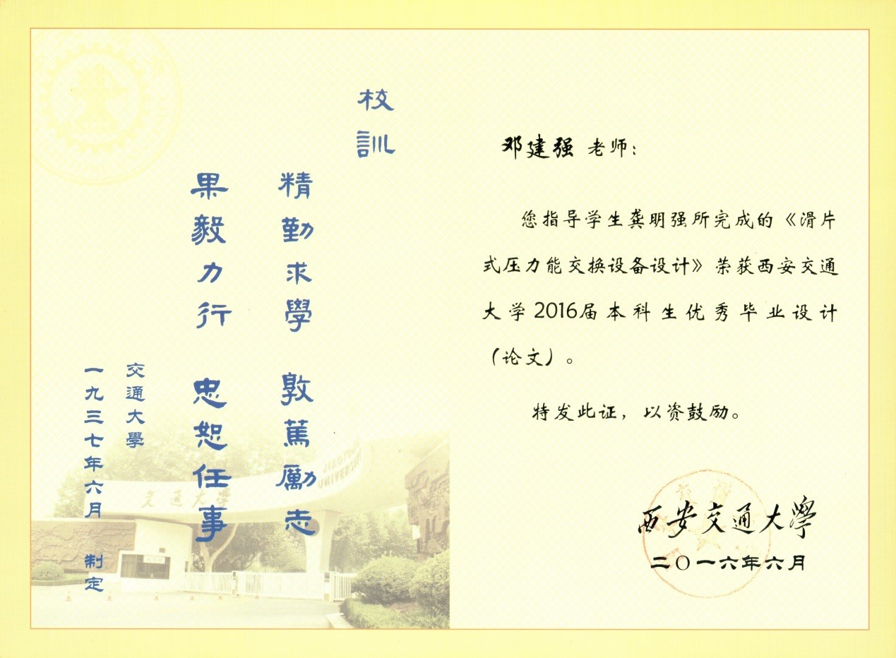 龚明强同学在取得保送研究生资格后继续努力,设计加工了一种滑片式压力能交换设备并对其进行了初步实验研究,凭此荣获2016校级本科优秀毕业设计(论文),为课题组争光添彩。希望龚明强同学在以后的科研道路上再接再厉,勇攀高峰!化工学院每年拥有1名校优名额或推荐1名同学参加学校的优秀毕设答辩,这是本课题组继2014年叶芳华同学获得校优毕设后,再一次获得了该荣誉。