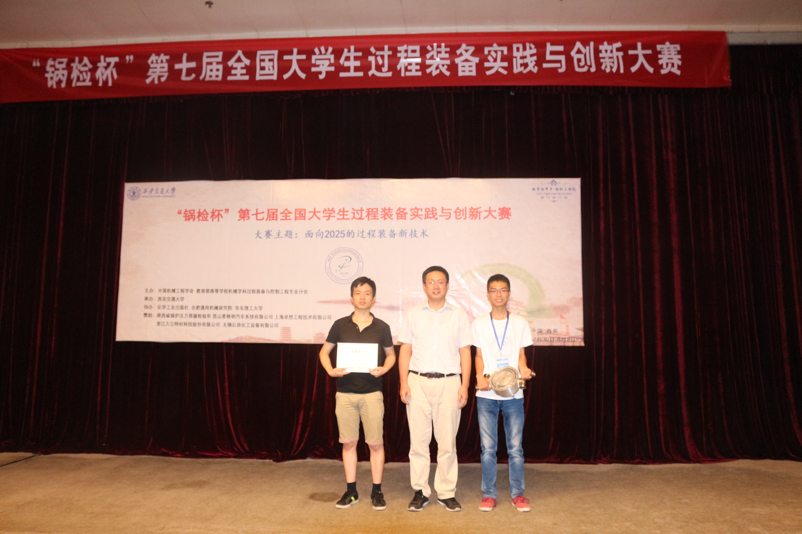在由中国机械工程学会、教育部高等学校机械学科过程装备与控制工程专业教学指导分委员会主办,西安交通大学承办的“锅检杯”第七届全国大学生过程装备实践与创新大赛中,课题组下学期保送上研的龚明强同学和两位大三同学组成的团队作品“新型容积式余压回收设备的设计开发”荣获“锅检杯”第七届全国大学生过程装备实践与创新大赛特等奖(麦格纳最佳流体机械奖)。