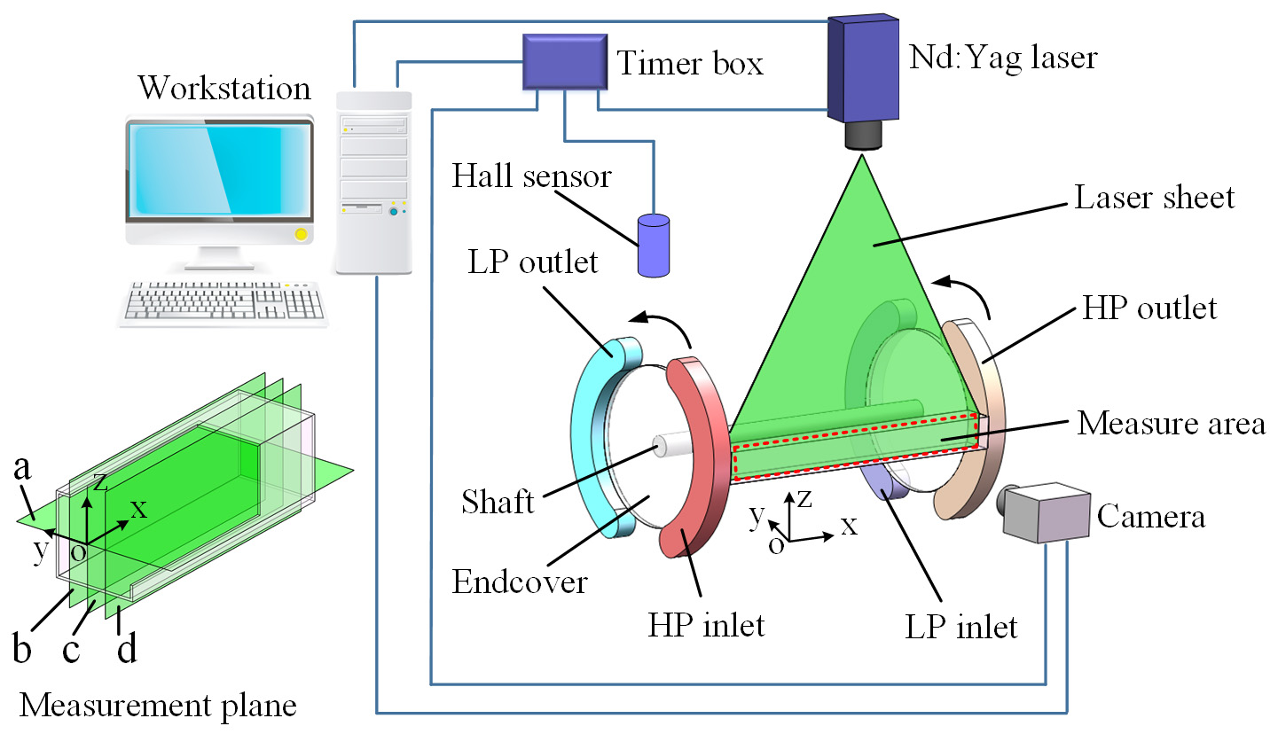 图 1 旋转配流盘式压力能交换器示意图                       2 PIV内部流场可视化实验示意图