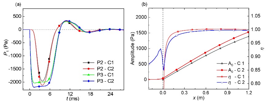 图2 C1与C2中压力变化(a)P2和P3处波形(b)入射波的幅值以及反射波与入射波幅值的比值