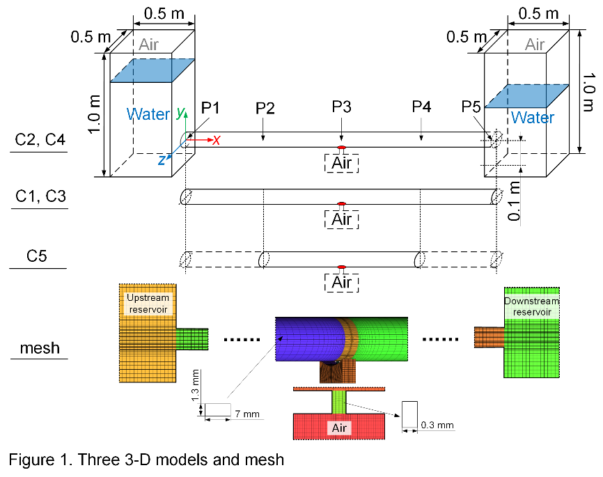 通过对压力波水力特性的文献进行调研,我们发现实验中反射波有两种类型:与入射波的幅值、压力变化方向均相同;与入射波的幅值相同,压力变化方向相反。而在模拟时,需要保证模拟中的反射特性与实验中的一致。为了确定合理的边界条件,论文通过CFD模拟对五种边界条件组合下的压力波反射现象进行了模拟,分别是:C1、压力入口压力出口。C2、管道两端连接水箱。C3、一端为速度边界,一端为压力边界。C4、一端设置为壁面边界。C5、在原始管道的基础上截取一部分管道。