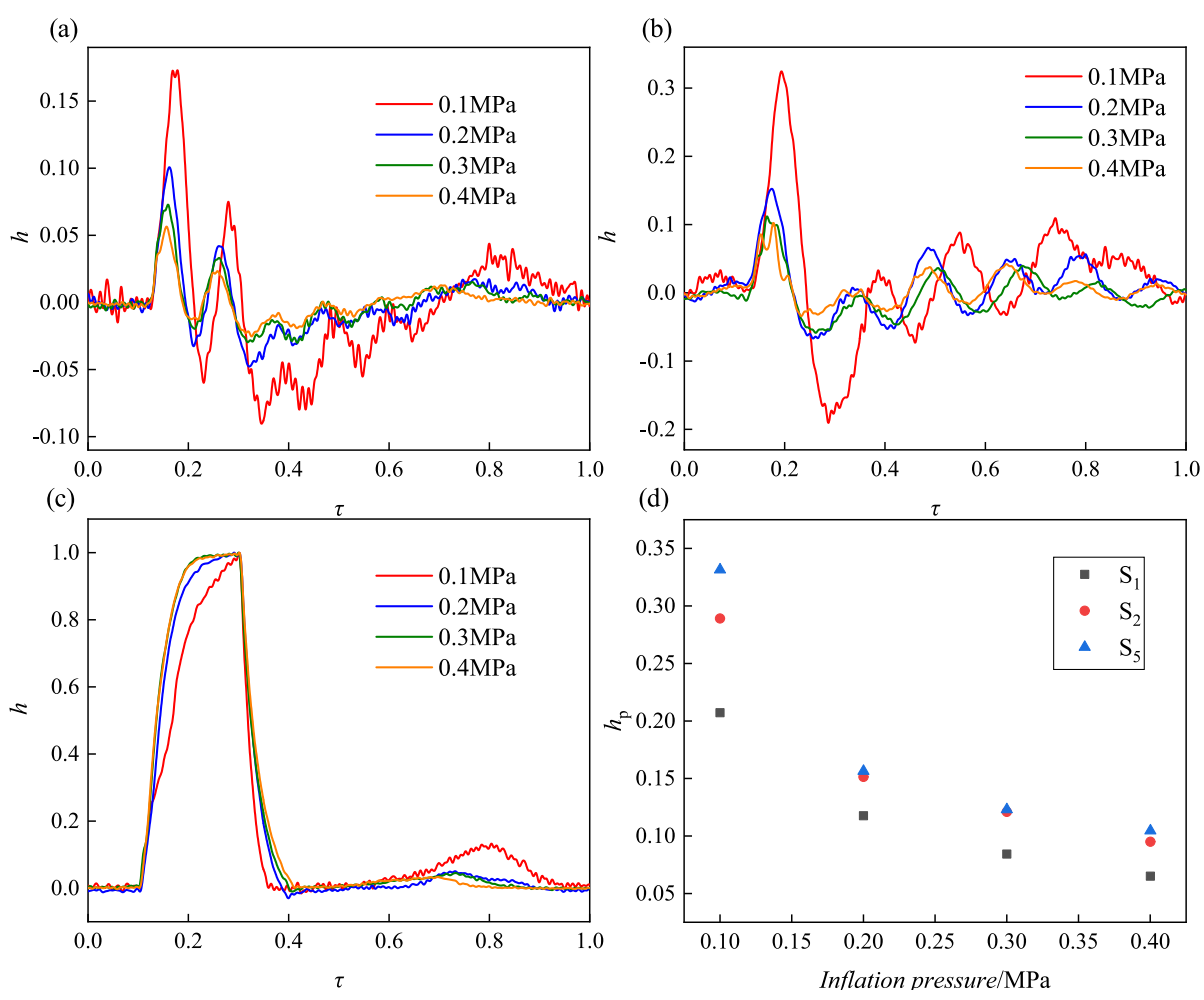 情况2在不同压力传感器上的压力波。(a)S1; (b)S5;(c)S3;(d)S1、S3、S5的峰值