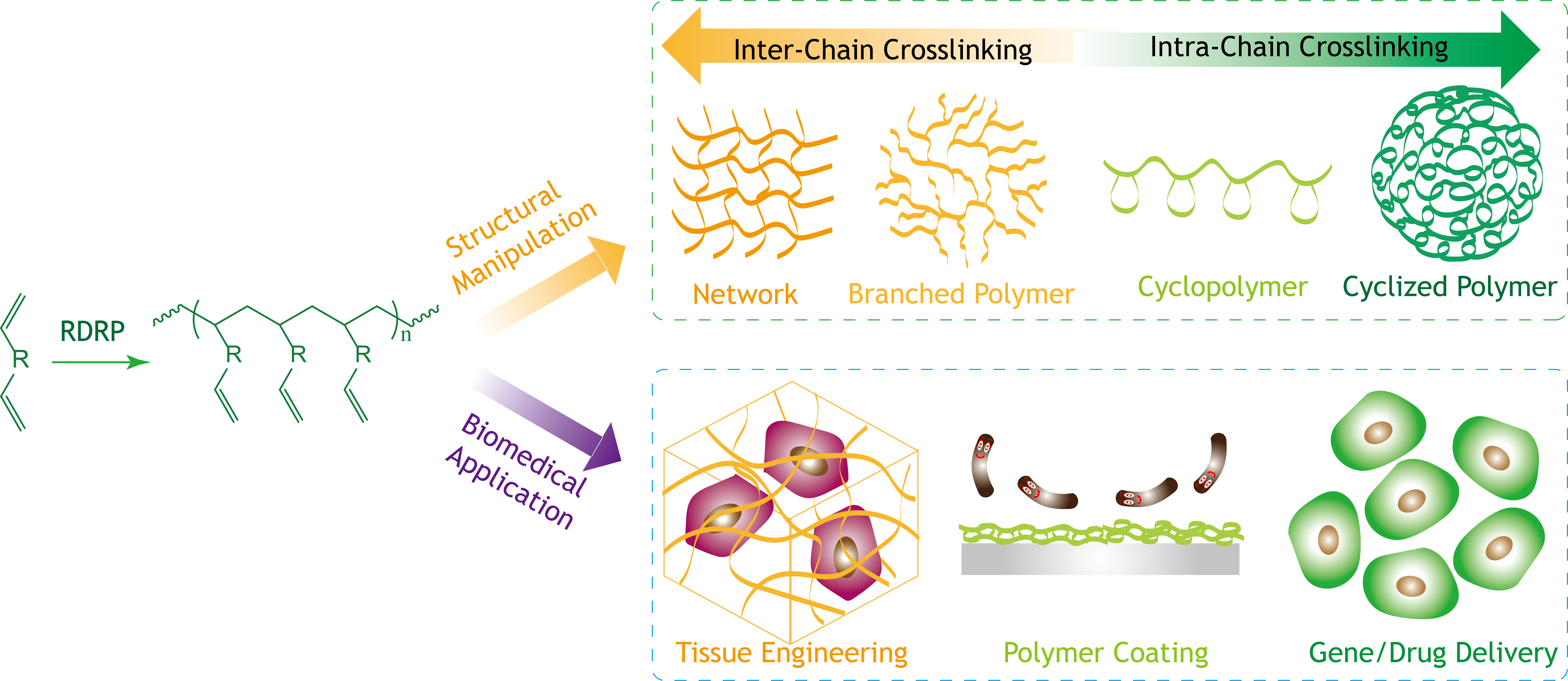 Seventy years ago, the Flory-Stockmayer (F-S) theory has predicted that the polymerization of multivinyl monomers (MVMs) would inevitably lead to gelation, even at a low monomer conversion (typically <10%), which has been verified by experiments repeatedly, therefore since then the polymerization of MVMs has been considered uncontrollable and the use of MVMs has largely been limited to as cross-linking agents. More recently, however, polymerization strategies such as reversible deactivation radical polymerization (RDRP) have paved the way for the exploration of new possibilities in the polymerization of MVMs, in terms of both polymer architectures and functional capabilities. By kinetically controlling the propagation of the polymer chains such as growth boundary (kinetic chain length), dimension and the concentration, the gelling point can delayed to a high level of monomer conversion and the two distinguished macromolecular architectures can be achieved: by selectively promote the inter-chain crosslinking while suppressing intra-chain crosslinking, hyperbranched polymers can be synthesized; in contrast, by selectively promote intra-chain crosslinking while suppressing inter-chain crosslinking, single-chain cyclized polymers can be synthesized. These studies have opened the door for the design and large-scale preparation of highly functional new polymer architectures. Our continued study on this topic will be: 1) mechanistic understanding of the RDRP of MVMs; 2) structural manipulation and topological effect investigation of polymers synthesized by the RDRP of MVMs; 3) exploration of biomedical applications of the synthesized polymers in tissue engineering, polymer coating and gene/drug delivery etc.