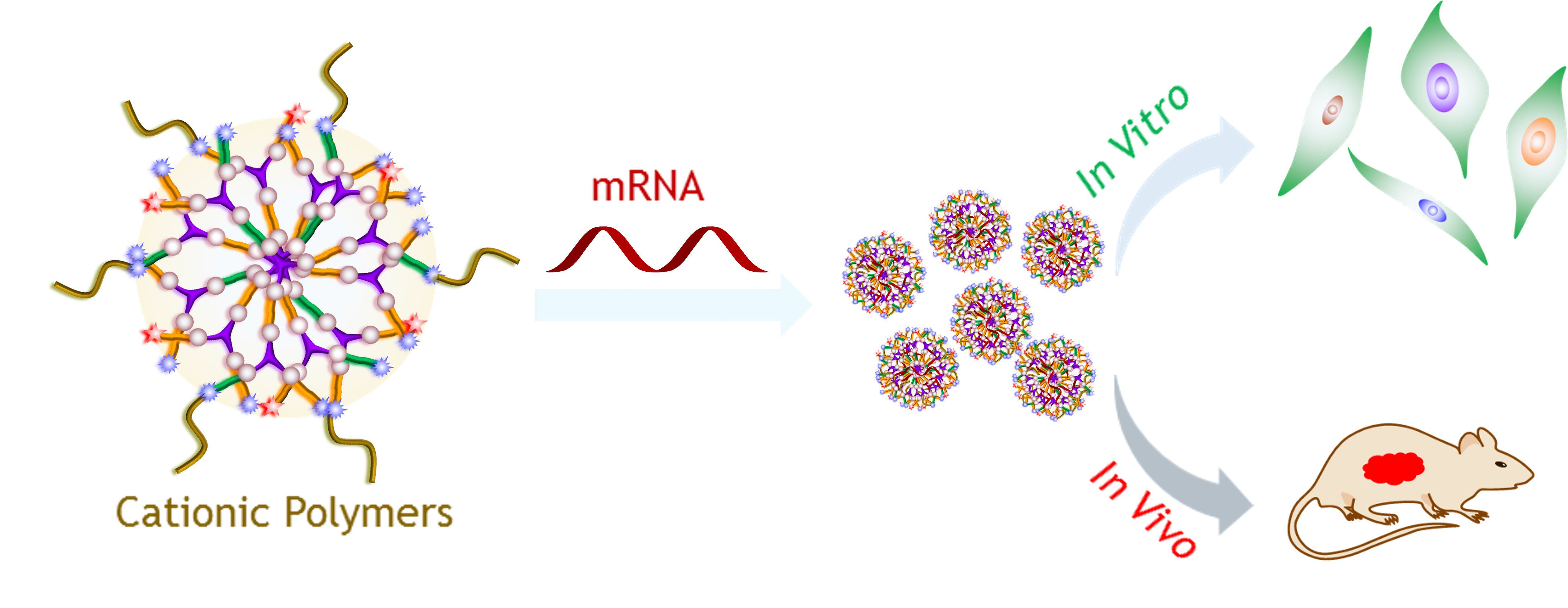mRNA is the template for the synthesis of proteins. The vast amount of research done at a molecular level has revolutionized mRNA as the new therapeutics. Unlike plasmid DNA based gene therapy which has been established for many years, mRNA based therapeutics are still in their infancy. Compared to DNA, the use of mRNA in gene therapy has multiple advantages. Firstly, since mRNA exerts its function in the cytoplasm, its activity will not depend on nuclear envelope breakdown which is involved in DNA based gene therapy. Secondly, given its site of action, mRNA therapy does not necessitate genomic integration and thus would only raise the low potential of risk of insertional mutagenesis that viral based gene therapy has been plagued with to date. Hence, mRNA has a significantly higher safety profile than DNA in gene therapy for clinical applications. Furthermore, mRNA gene therapy circumvents the need for selecting a specific promoter, and thus the transfection process is relatively efficient and facile. Finally, regarding the production process, raw material synthesis and the product quality of mRNA can be standardized more easily than for DNA, which gives rise to mRNA based gene therapy with an additional advantage in reproducibility. Nevertheless, challenges associated with the application of mRNA gene therapy still exist, especially the inability to deliver therapeutic mRNA into cells efficiently. Since mRNA is a type of large poly-anionic molecule, it cannot cross cellular and tissue membranes directly and can be degraded easily by nucleases. Despite the considerable attention and focus that mRNA based gene therapy has garnered, relatively few kinds of materials have been proved to be effective mRNA delivery vectors, directly adapting DNA or siRNA delivery vectors as mRNA vectors does not translate into effective mRNA delivery. Therefore, our efforts on this project are to develop reliable mRNA delivery systems to accelerate the translation of mRNA gene therapy from bench to bedside.