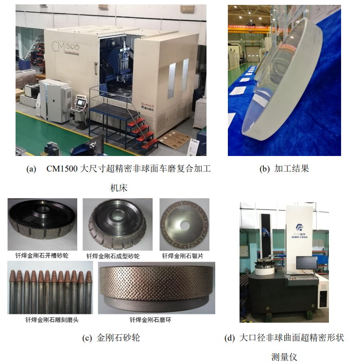 在04国家科技重大专项(2011ZX04004-061)支持下研制的加工口径可达Ф1500mm的大尺寸超精密非球面车磨复合加工机床是国内最大的具有自主知识产权的光学非球面磨床,总体技术水平达到国际先进。研制出了测量范围大于1000mm的大尺寸非球面专门测量装置以及精密高效加工用系列金刚石砂轮。打破国外在大尺寸光学非球面加工制造领域的垄断,提高了我国相关技术产品自主创新的开发实力和市场竞争力。