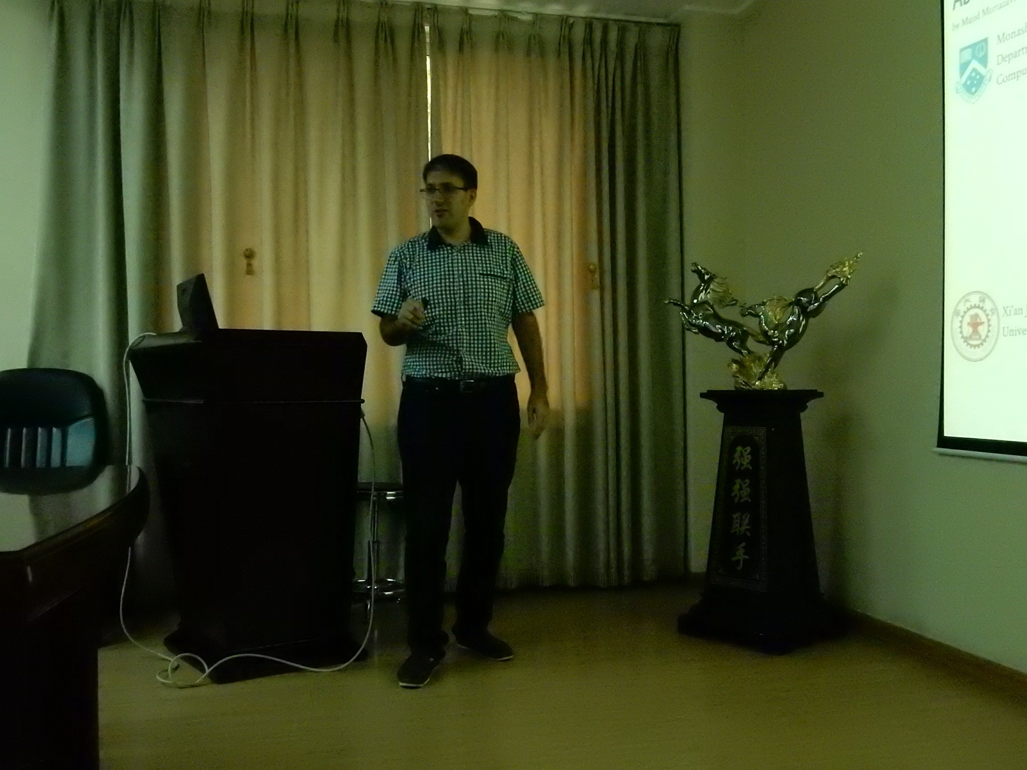 内容: 近日,应课题组邓俊楷老师的邀请,澳大利亚莫纳什大学Majid研究员来到金属材料强度国家重点实验室进行为期约半个月的访问交流。在此期间,Majid研究员与丁向东教授组内师生就相关课题、科研经验以及文化等方面进行了交流互动,并提出了许多珍贵的意见。Majid 研究员思维活跃,博学多识且善于交流,给大家留下了非常深刻的印象,并于5月6日上午10点在材料学院作了题为: Ab Initio Study of Electrode Materials for Rechargeable Batteries 的讲座,吸引了诸多师生并展开了激烈的讨论。 Majid研究员作报告 师生们专心聆听