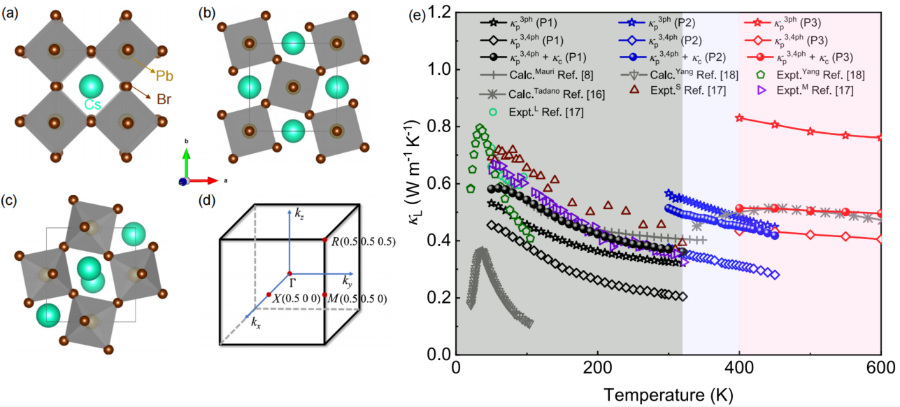 研究背景: 声子对于理解半导体中的热输运至关重要。在传统的第一性原理计算方法中,通过线性化的声子玻尔兹曼输运方程,利用准简谐近似下的非简谐晶格动力学,可以得到Grüneisen参数、热膨胀、声子群速度、三声子寿命和线宽等重要参量。然而,传统的方法忽略了一些重要的因素,面临着一些挑战: 长期以来,像四阶原子相互作用这样的高阶原子相互作用被忽略了,比如在BAs中,四声子散射对κL的抑制作用约为三声子作用的40%。原子间非简谐性随温度升高而增加,然而,微扰方法很难处理强非简谐系统,例如具有简谐声子虚频率的立方ABX3钙钛矿,因此,我们应该使用具有温度相关效应的自洽声子(SCPH)来研究非简谐声子重整化的重要性。代表类波相干声子隧穿传热的热流算子中的非对角项可以提供一种潜在的方法,以弥补传统的Peierls-Boltzmann输运方程与超低导热材料和类玻璃材料实验测量之间的鸿沟。 在本研究中,我们系统地研究了四阶非简谐性和非对角项对CsPbBr3三个不同的相晶格动力学和热输运性能的影响。我们用第一性原理结合最新的理论进行计算:利用CSLD(压缩感知晶格动力学)方法高效重建原子间的三四阶力常数;利用SCPH理论和和高阶声子散射准确计算温度依赖的声子散射率;同时考虑对角项和非对角项声子对热导率的影响。结合上述理论我们可以准确计算低热导材料的热导率,得到与实验测量很接近的结果。