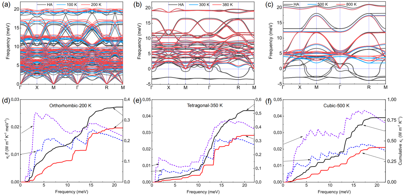 图2 不同温度下的含温声子谱和累计热导率与频率分布热导率 (a)正交相,(b)四方相,(c)立方相在不同温度下的重整化声子谱。HA是简谐近似。(d)、(e)和(f)分别是在不同温度下使用3ph(上线)和3,4ph(下线)方法得到的频率分布κL(虚线)和累积κL(实线)