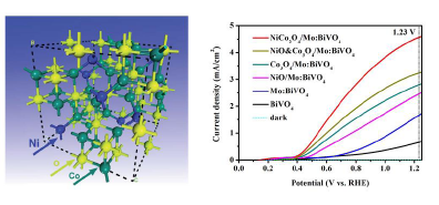 钴酸镍(NiCo2O4)作为一种过渡金属氧化物的半导体引起广泛关注。曾有报道称,尖晶石结构的NiCo2O4拥有比NiO或Co3O4更好的电导率(高出两个数量级以上)和电化学性能。 而且,NiCo2O4是一种禁带宽度为2.1 eV的p型半导体,能够很好地与BiVO4匹配形成p-n异质结。在这里,我们利用超薄介孔的NiCo2O4纳米片来修饰BiVO4的纳米多孔光电极。结果显示,NiCo2O4/Mo: BiVO4光电极由于光生载流子的有效分离和优异的表面反应动力学表现出了非常高的光电流密度(4.5 mA/cm2, AM 1.5G, 100 mW/cm2)。