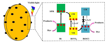 BiVO4作为一种优异的光催化材料被广泛应用于可见光下分解水和降解有机污染物。研究表明,BiVO4 作为n型半导体能够与另一种p型半导体结合形成p-n异质结构;此外,金属的等离子共振效应能够使光生电子很容易地累计在半导体的导带,进一步促进光生电荷的分离。不同于以往单独的异质结或者表面金属等离子共振结构,我们首次合成了同时具备异质结和表面金属等离子共振混合结构的三元Bi/BiOCl/BiVO4纳米片。