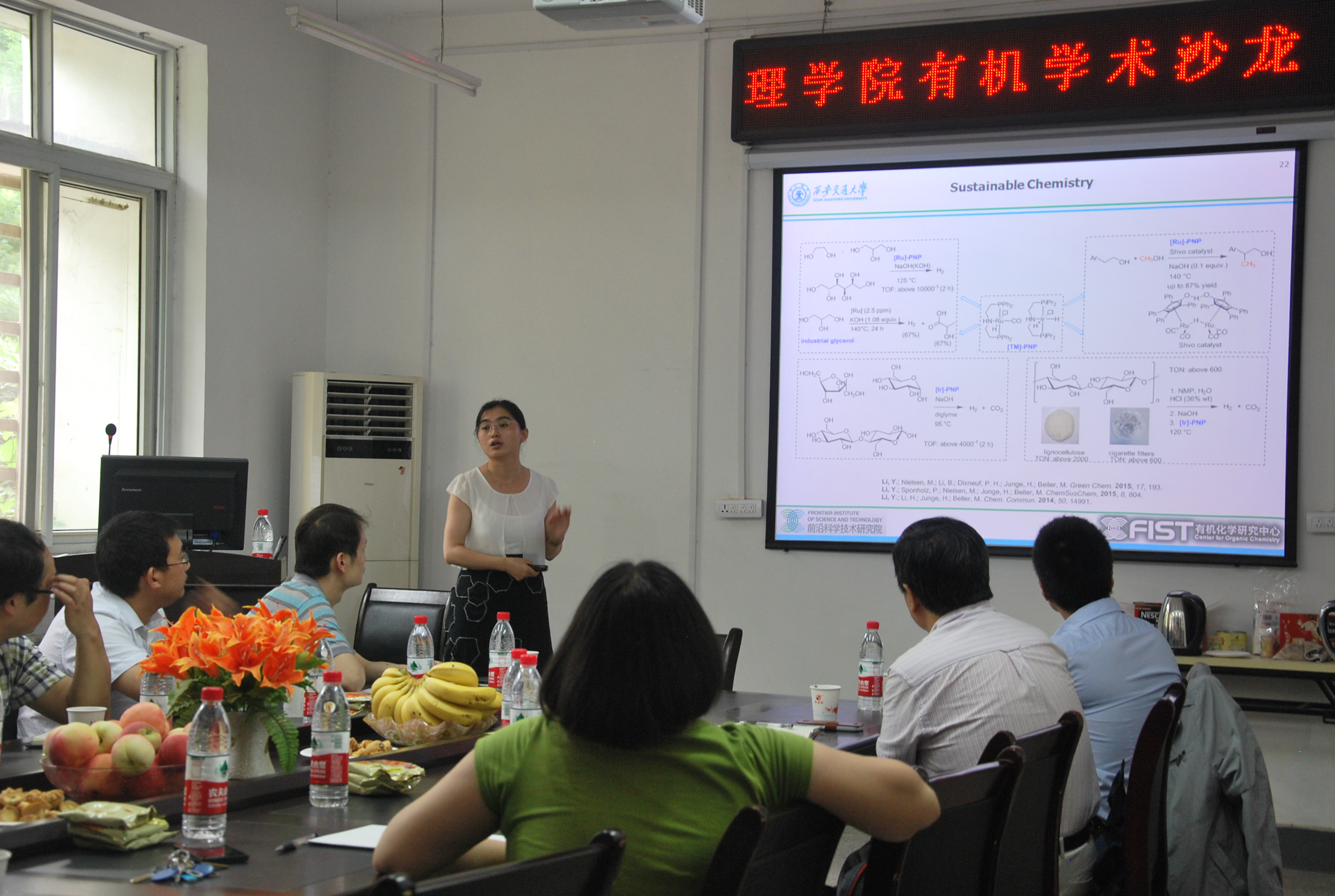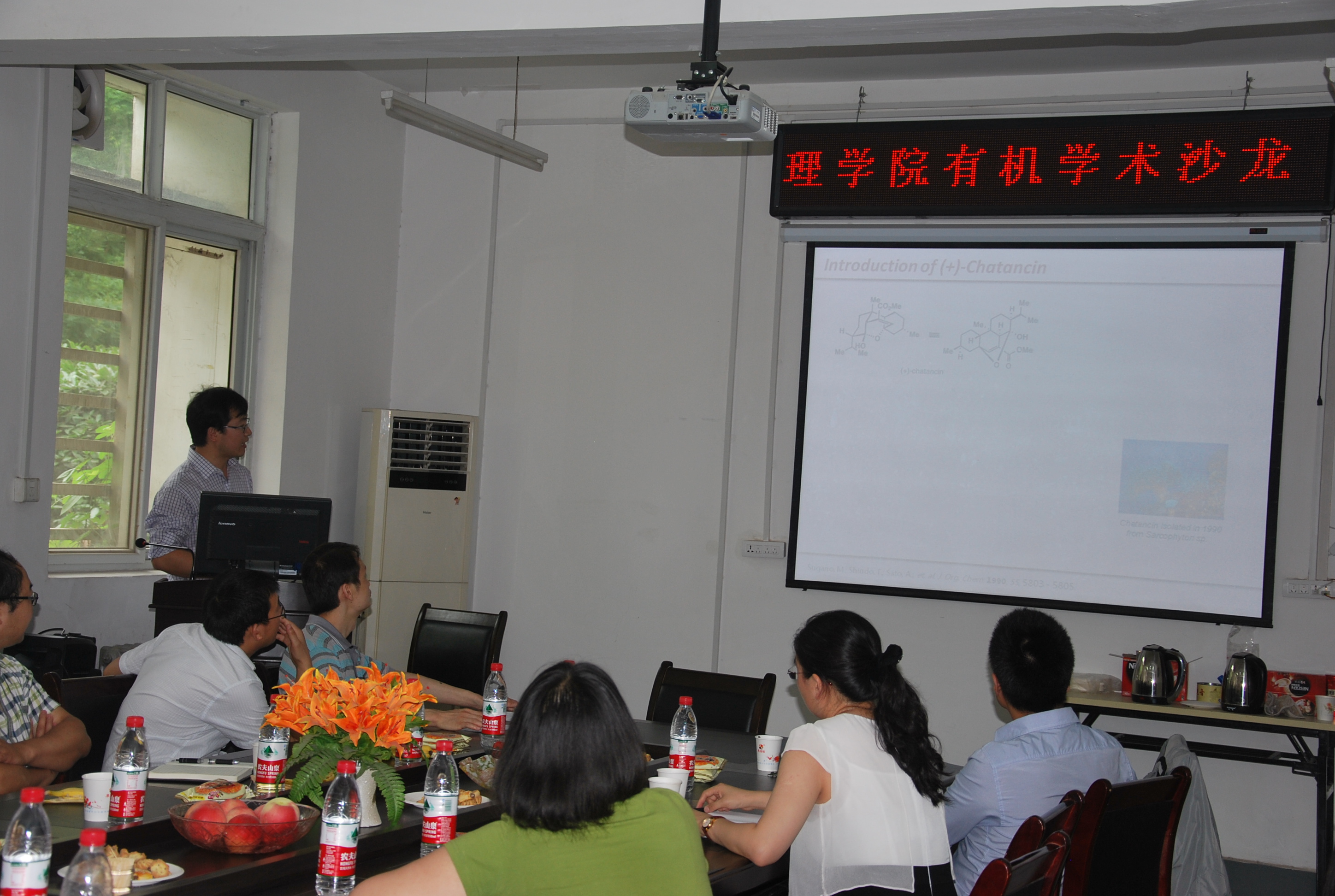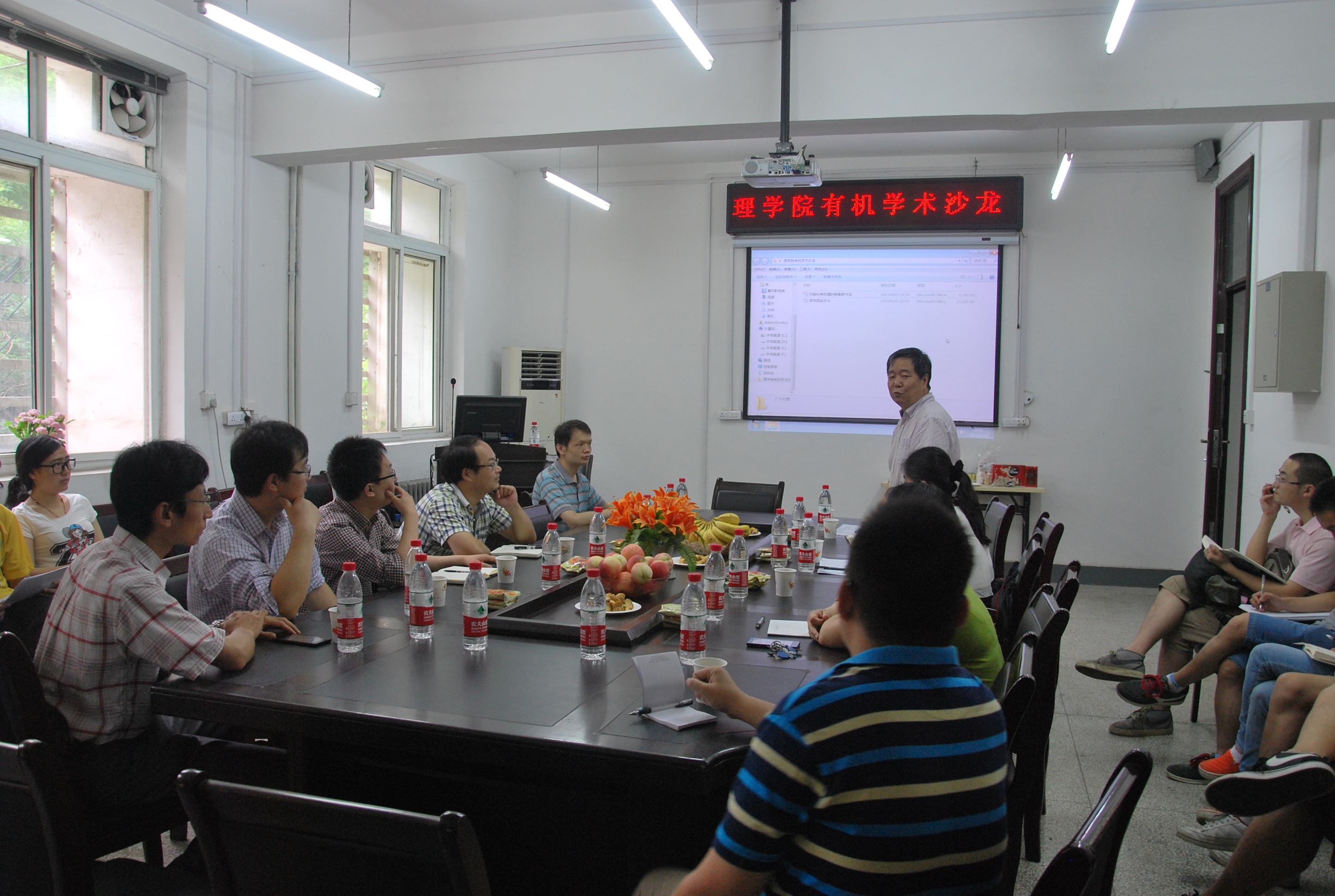 由理学院党委组织、化学学科承办的有机合成化学学术沙龙于2015年6月26日(周五)9:00到18:40在化学楼207报告厅成功举办。本次论坛共邀请到来自西北农林科技大学、西北大学、陕西师范大学、重庆大学以及西安交通大学等科研单位共十余位老师参与。报告的内容涉及天然产物合成、绿色可持续及能源催化、功能有机硼合成新方法、卡宾催化、金催化有机反应、苯炔化学以及脱羧偶联环化等有机合成前沿领域。共有7位来次不同院校的老师在本次活动中详细的介绍他们近年来在科研方面取得的进展并分享他们在科研工作中的酸甜苦辣,勉励青年学生努力工作!在报告中同学和老师们对共同感兴趣的问题进行了热烈的讨论。