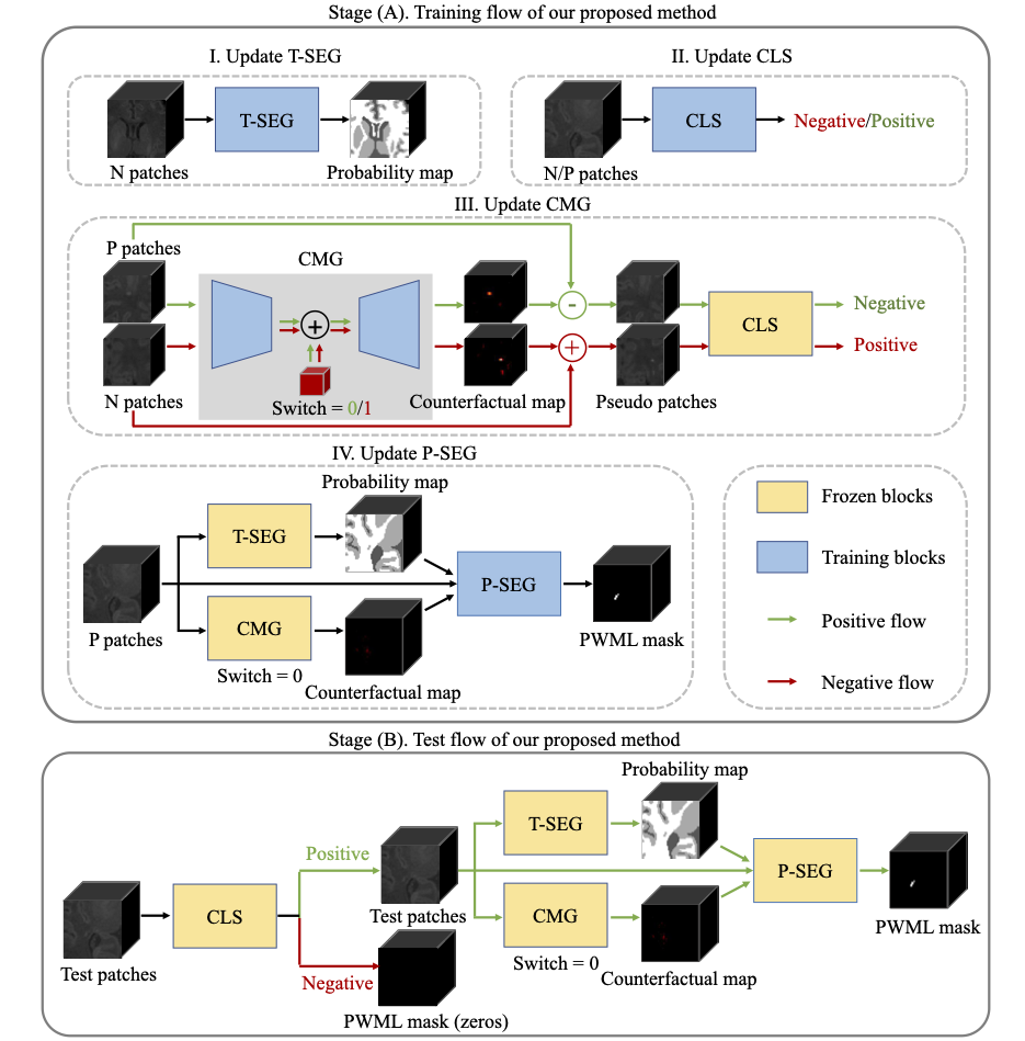 我们针对这一问题提出利用反事实推理的思想,结合脑组织分割的辅助任务来学习该病变的精细的位置信息和形态表征,以实现准确的定位和分割。其中反事实推理可以为病变分割提供初步的病变“定位”指导,而脑组织分割任务中自然包含了和病变分割任务相关的解剖先验知识和位置引导。