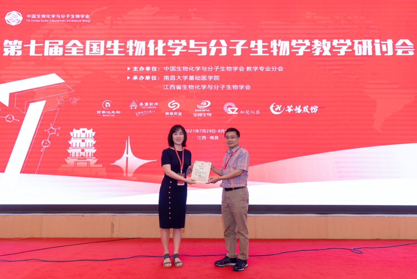 2021年7月29日-8月1日,在江西南昌召开的第七届全国生物化学与分子生物学教学研讨会,主要探讨生化与分生的金科建设、混合式教学、教学资源、虚拟仿真和教学示范。郑芳博士应邀在大会上作报告。