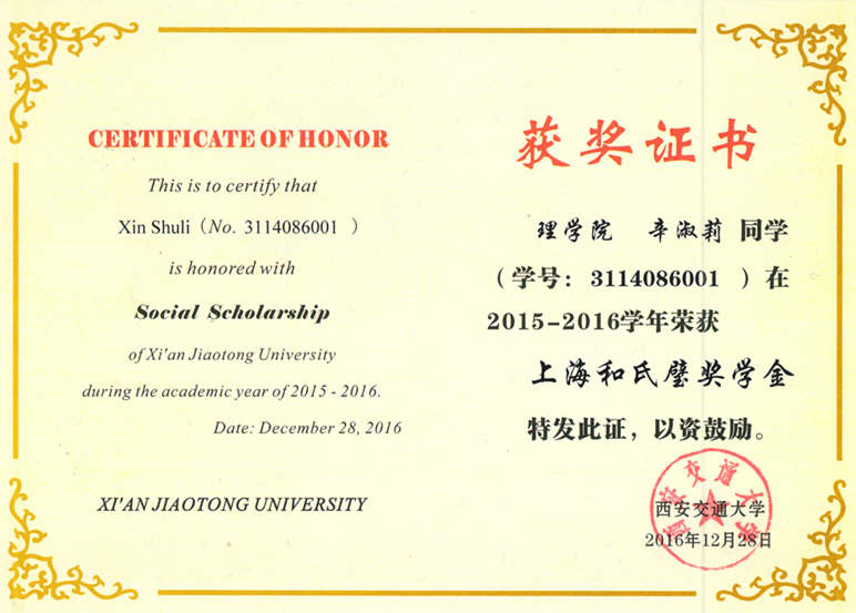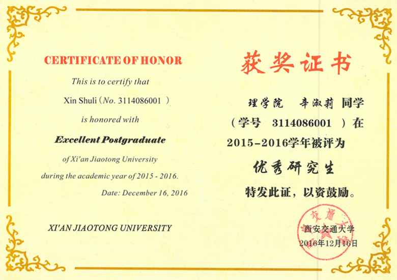 恭喜辛淑莉同学获得“优秀研究生”称号和“上海和氏璧奖学金”。