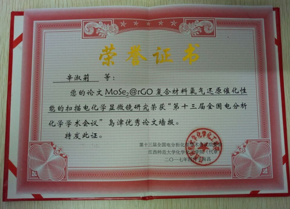 近日,辛淑莉同学在4月13-16日在南昌举行的国内电分析领域的最高级别学术会议 -- “第十三届全国电分析学术会议”上获得优秀论文墙报奖!