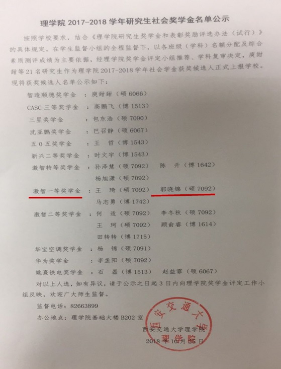 恭喜课题组郭晓锦同学同时荣获特等学业奖学金、激智一等社会奖学金、西安交通大学优秀研究生称号