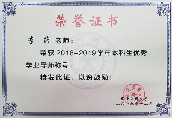 - 恭喜李菲老师获得西安交通大学2018-2019学年本科生优秀学业导师称号!