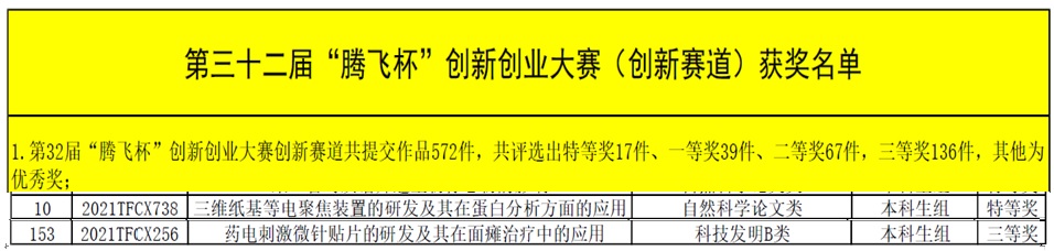 - 恭喜本科生魏子宁和许贝多、苗润、宫建桥、毕天龙、张露等 获第三十二届“腾飞杯”创新创业大赛特等奖和三等奖!