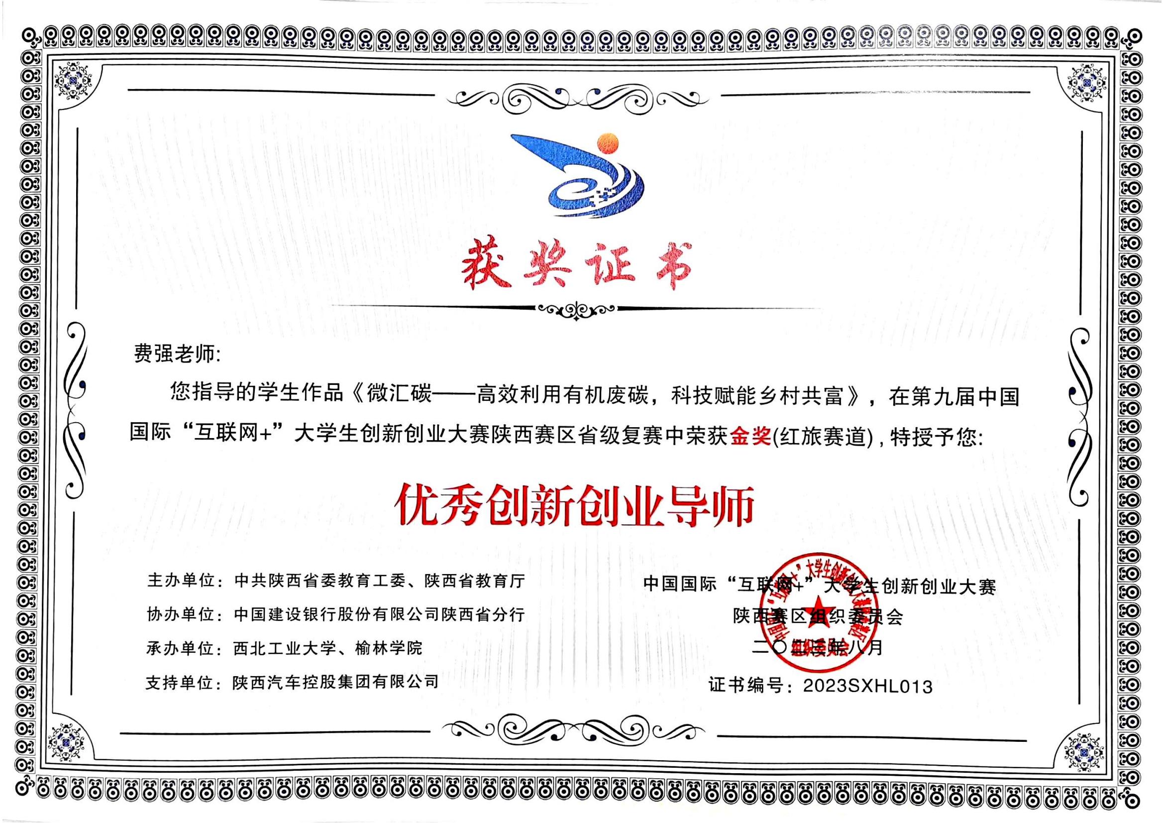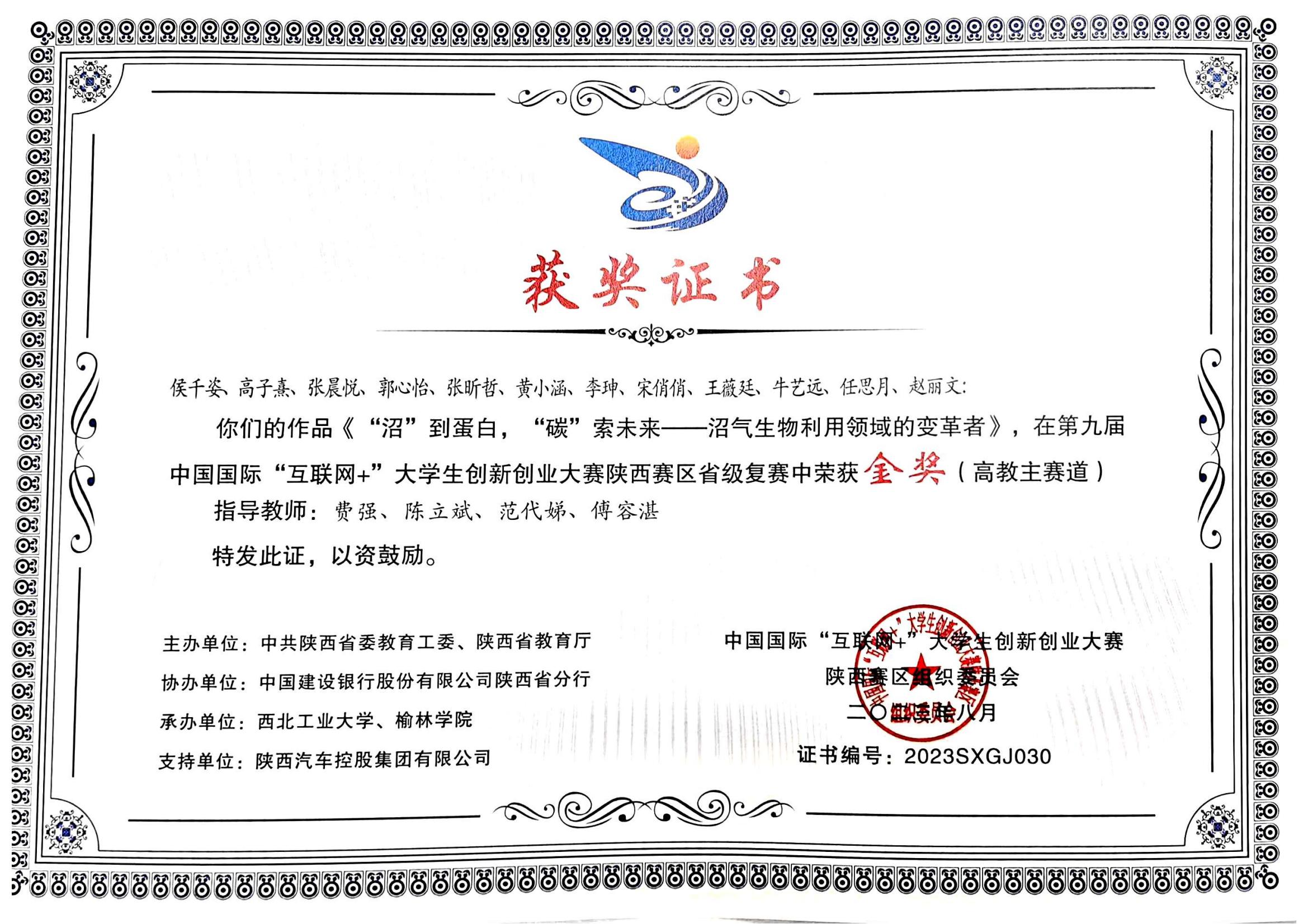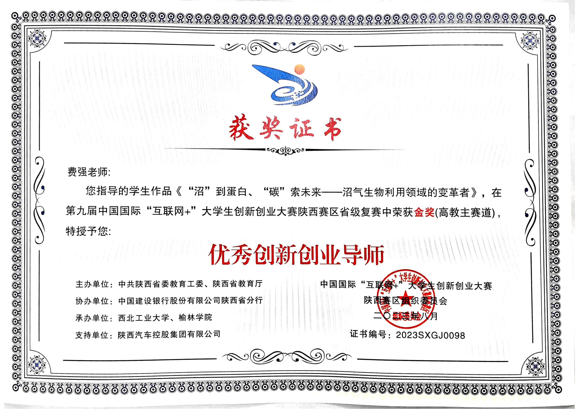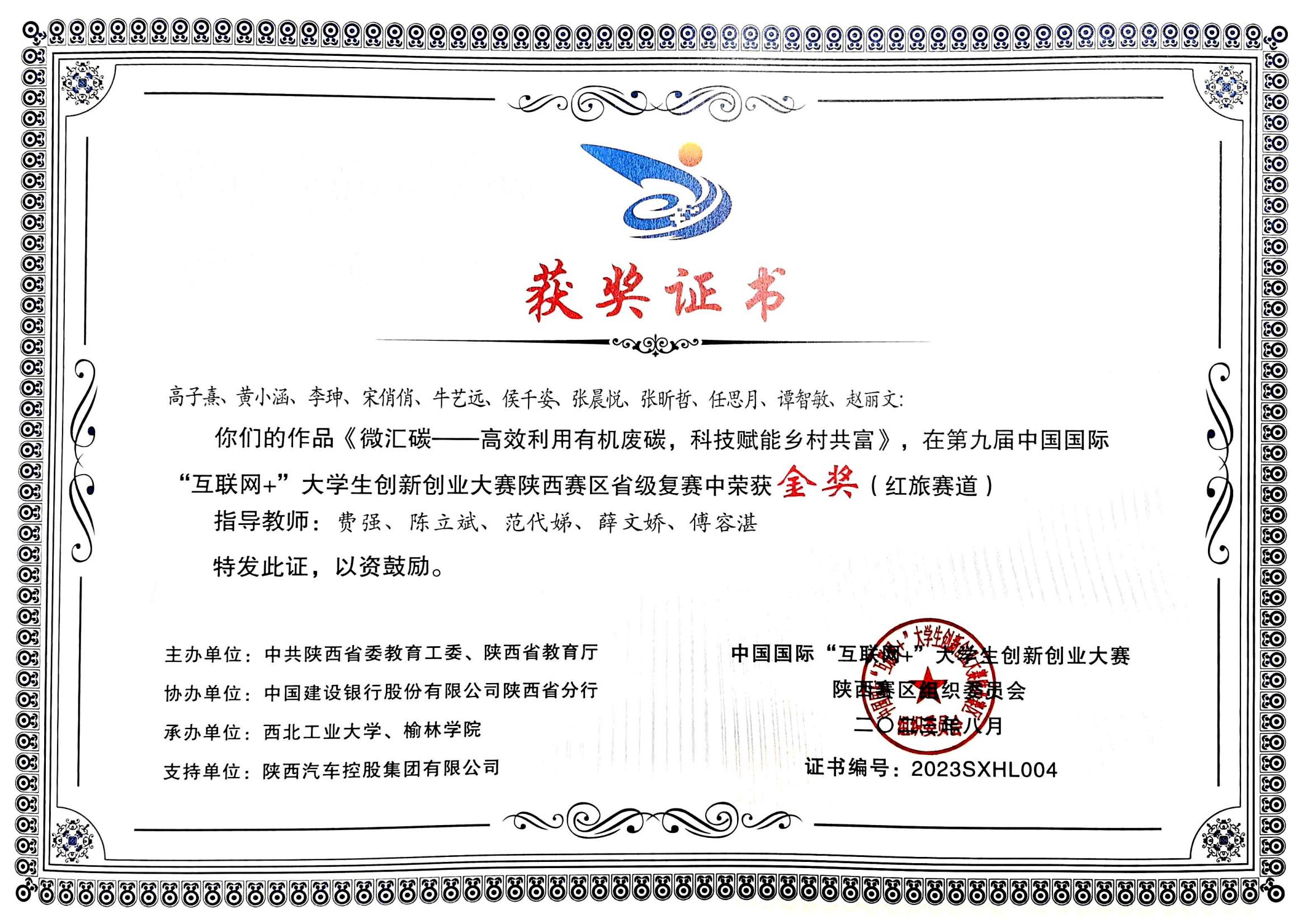 课题组学生高子熹、黄小涵、李珅、宋俏俏、侯千姿、张晨悦、张昕哲的参赛作品《微汇碳——高效利用有机废碳,科技赋能乡村共富》在陕西赛区省级复赛中荣获红旅赛道金奖。侯千姿、高子熹、张晨悦、郭心怡、张昕哲、黄小涵、李珅、宋俏俏、王薇廷的参赛作品《“沼”到蛋白,“碳”索未来——沼气生物利用领域的变革者》荣获高教主赛道金奖。费强教授被授予优秀创新创业导师。