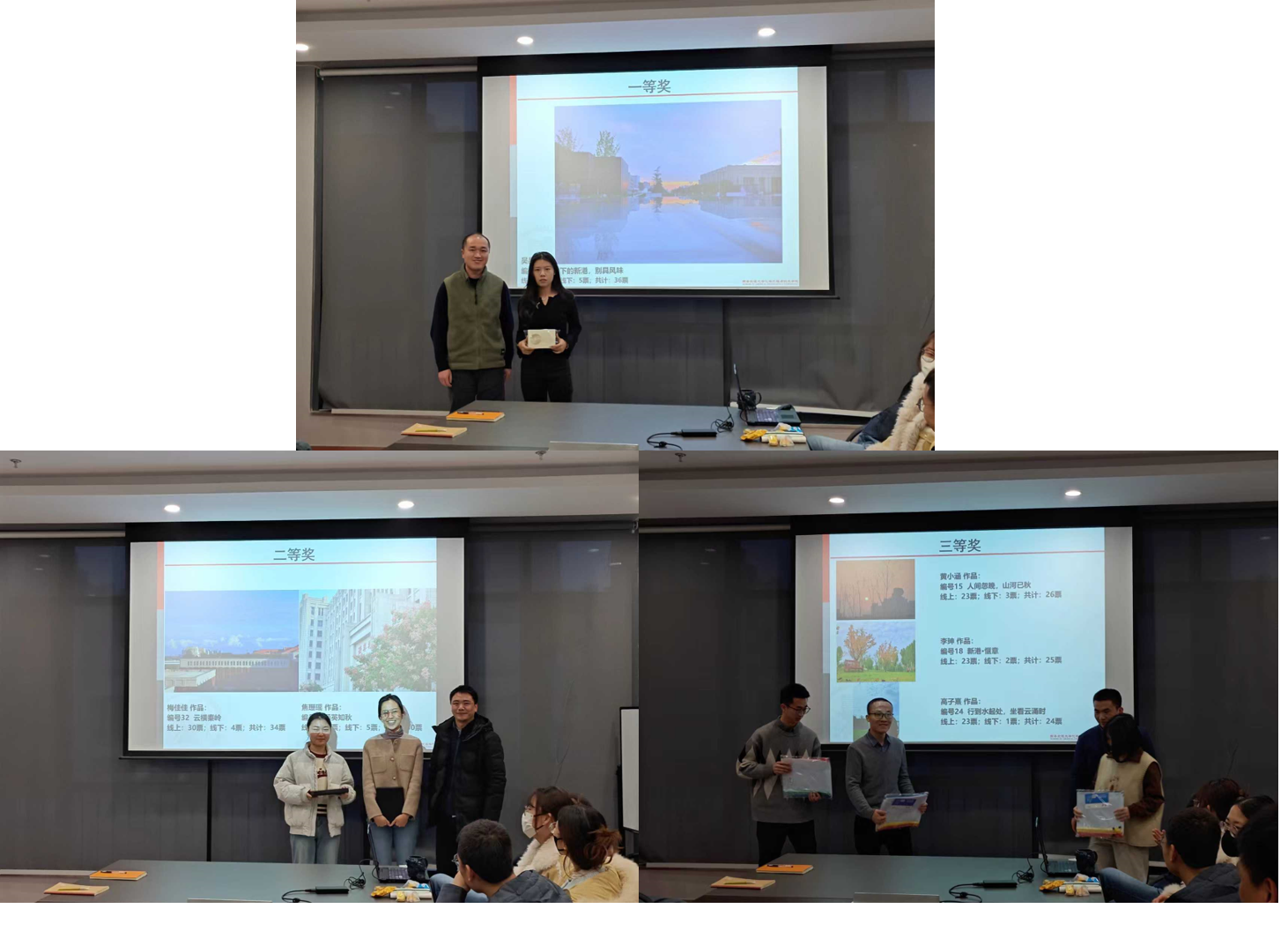 此次比赛共征集了32幅参赛作品,采用线上线下无记名投票的方式。其中线上投票借助“问卷星”平台进行数据收集,在师生间广为传播,收集总票数共计246票;线下投票分为组内投票和组外投票两个环节。最终经过两周的作品展示和投票,2023级硕士生吴晶同学的作品《镜像下的新港·别具风味》饱受好评(线上31票;线下5票,共计36票),荣获此次摄影比赛的一等奖;2023级硕士生梅佳佳同学的作品《云横秦岭》(线上30票;线下4票,共计34票)和2023级博士生焦珊瑶同学的作品《涵英知秋》(线上25票;线下5票,共计30票)荣获二等奖;2022级博士生黄小涵同学的作品《人间忽晚,山河已秋》(线上23票;线下3票,共计26票)、2022级硕士生李珅同学的作品《新港·惬意》(线上23票;线下2票,共计25票)、2020级博士生高子熹同学的作品《行到水起处,坐看云涌时》(线上23票;线下1票,共计24票)获此次摄影比赛的三等奖。课题组马英群老师、李爱朋老师、郭树奇老师为获奖学生颁发奖品。